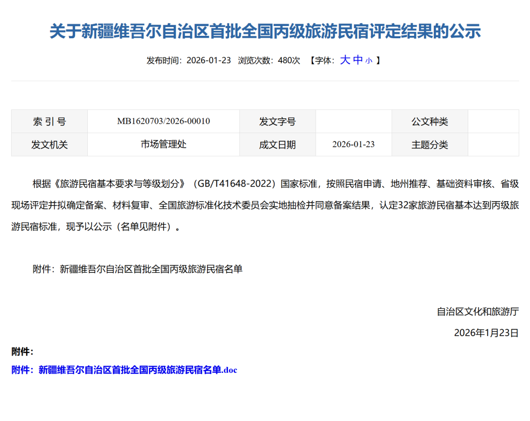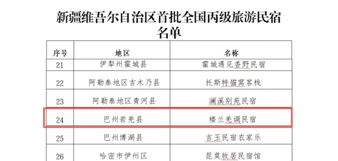近日,新疆维吾尔自治区文化和旅游厅发布《关于新疆维吾尔自治区首批全国丙级旅游民宿评定结果的公示》,若羌县楼兰羌调民宿成功入选自治区首批全国丙级旅游民宿名单,成为我县首家获得国家级等级认定的旅游民宿单位。