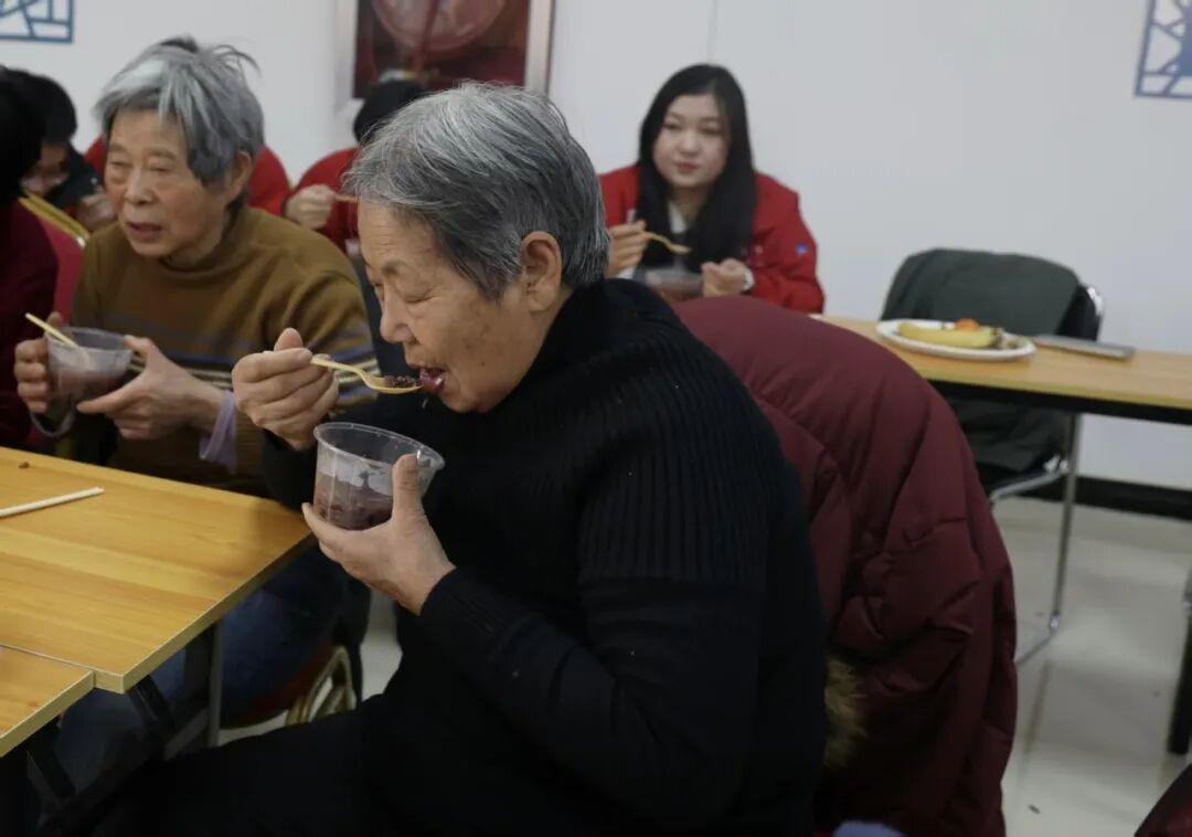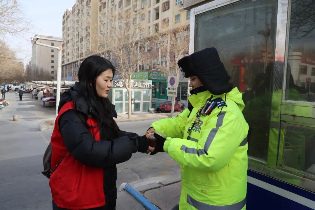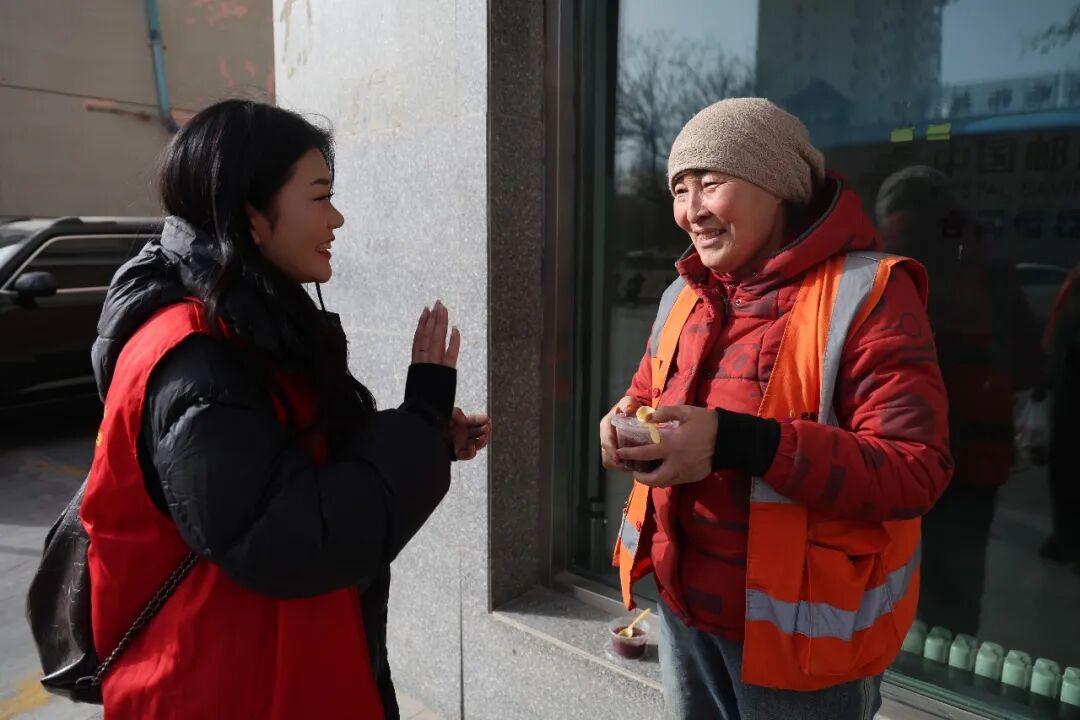 同时,志愿者们为坚守岗位的环卫工人、外卖骑手、快递员、交通警察等户外工作者以及独居老人、困难特殊群体,送上打包好的腊八粥,向他们道一声辛苦,并叮嘱注意冬日保暖。