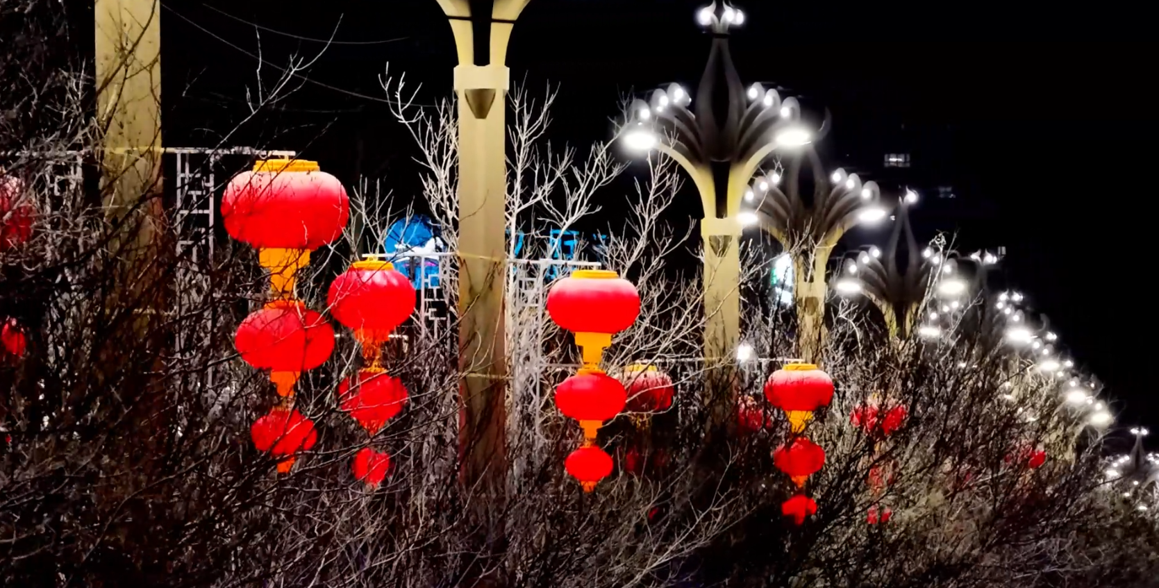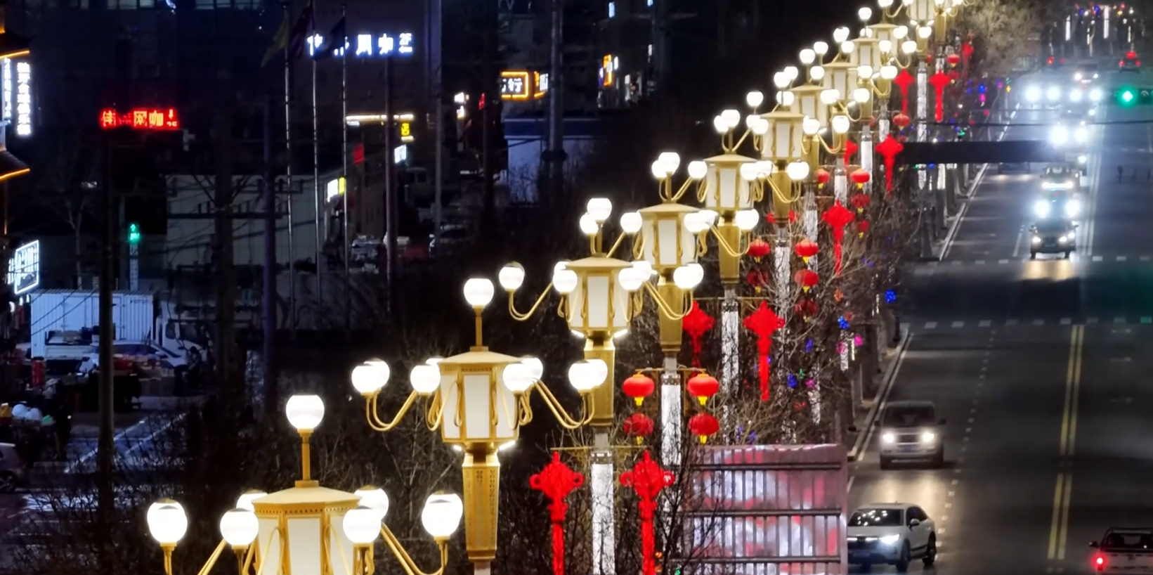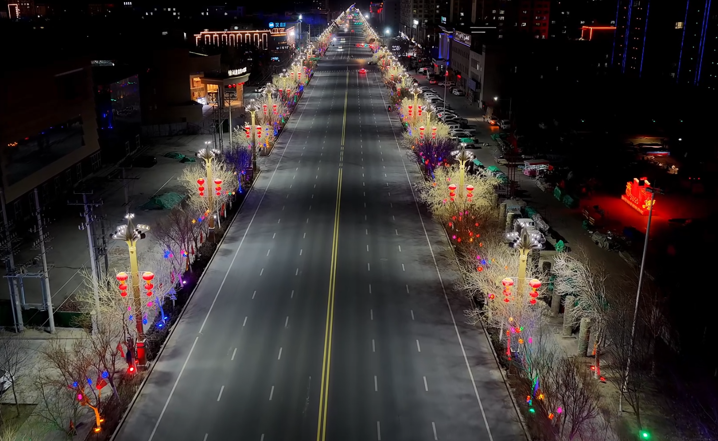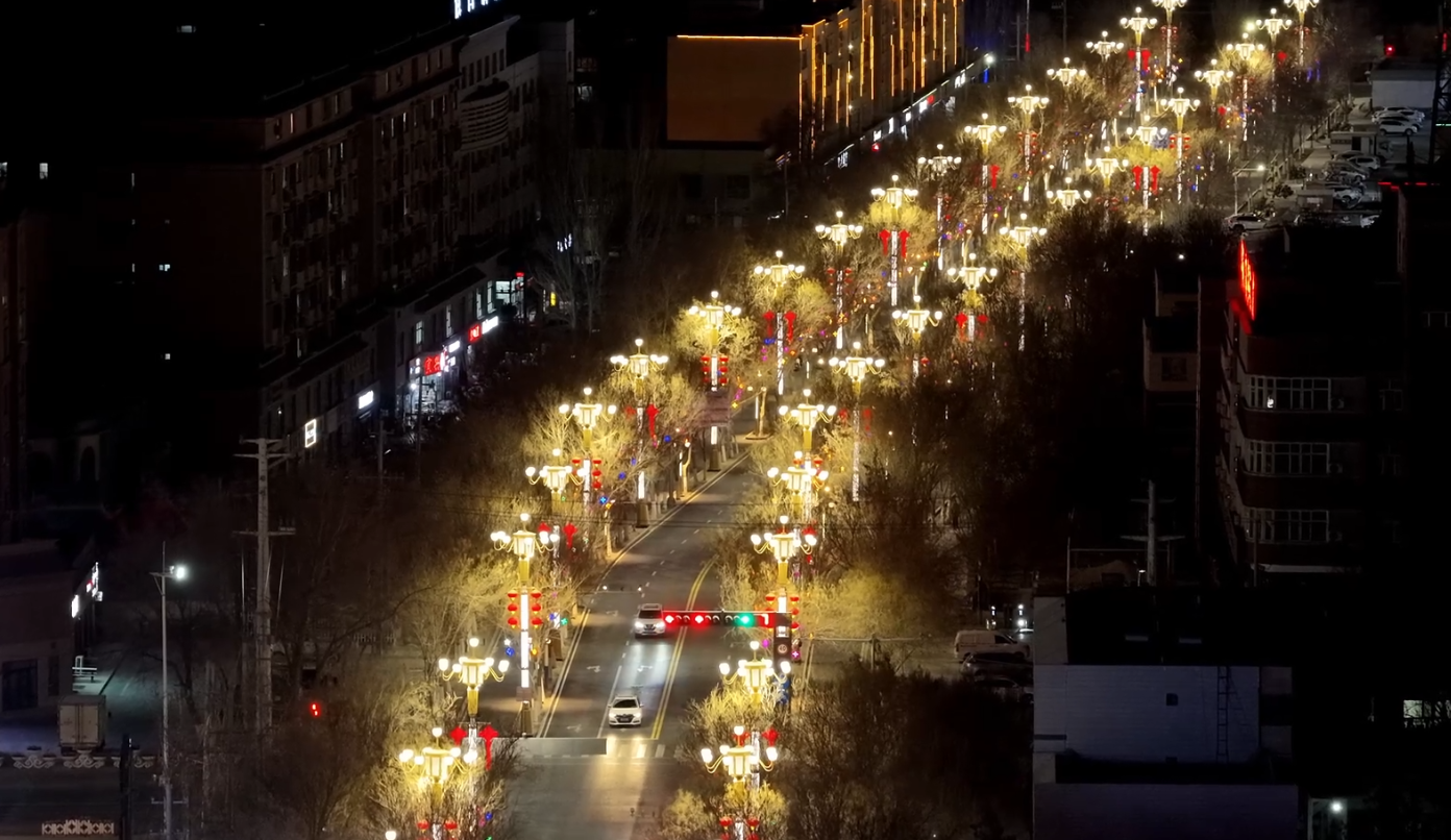 夜幕降临,华灯初上,若羌县街头巷尾彩灯高挂,年味浓郁。航拍镜头俯瞰县城,纵横交错的街道灯火璀璨,闪烁的彩灯与夜空交相辉映,火红的灯笼传递着新春的美好祝福,当地群众和游客在喜庆热烈、温馨祥和的氛围中欢度佳节。