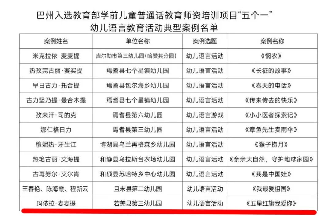 近日,教育部学前儿童普通话教育师资培训项目“五个一”案例评选结果正式揭晓。巴州在此次评选中表现突出,在上报的65个案例中,有11个案例成功入选“全国典型案例”。入选数量在区域内名列前茅,充分彰显了巴州教育系统在推进学前儿童普通话教育师资培训方面的扎实成效与创新活力。