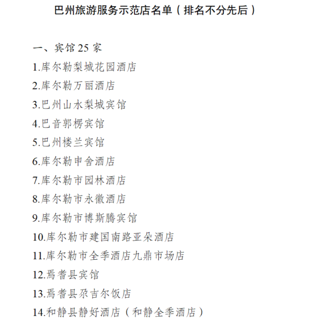 12月31日,巴州旅游服务示范店授牌仪式在花园酒店举行,全州50家宾馆、餐饮企业凭借优质服务与规范管理,获评“巴州旅游服务示范店”。