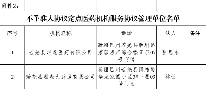 依据经办规程相关要求,若羌县医疗保障局党组会议研究讨论决定,若羌县普惠医药有限公司第二分公司、巴州福宁医药连锁有限公司若羌四分公司、若羌县永康药业有限公司、若羌县沁心堂药业有限公司现场评估考核合格,拟纳入巴州基本医疗保险定点医院机构服务协议管理。其余2家零售药店现场评估考核低于80分,不予准入协议定点医药机构服务协议管理。