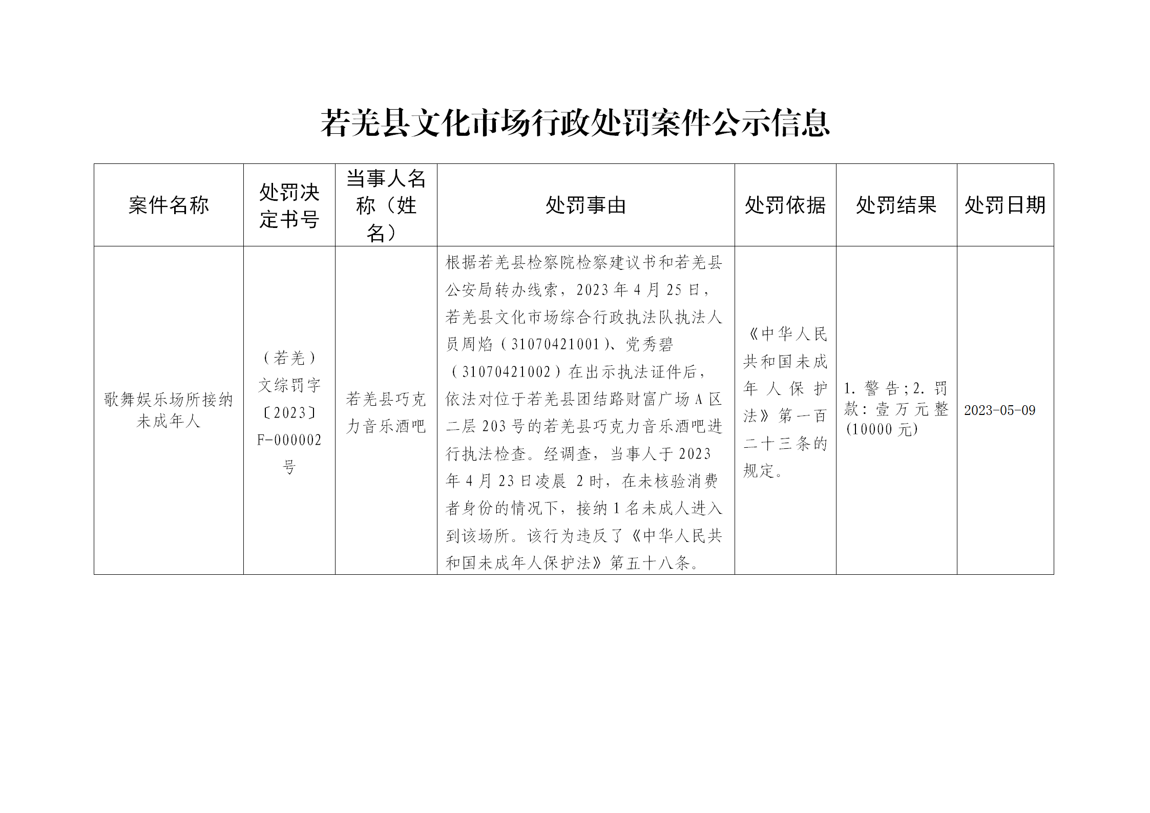 若羌县文化市场行政处罚案件公示信息文综罚字〔2023〕F-000002号