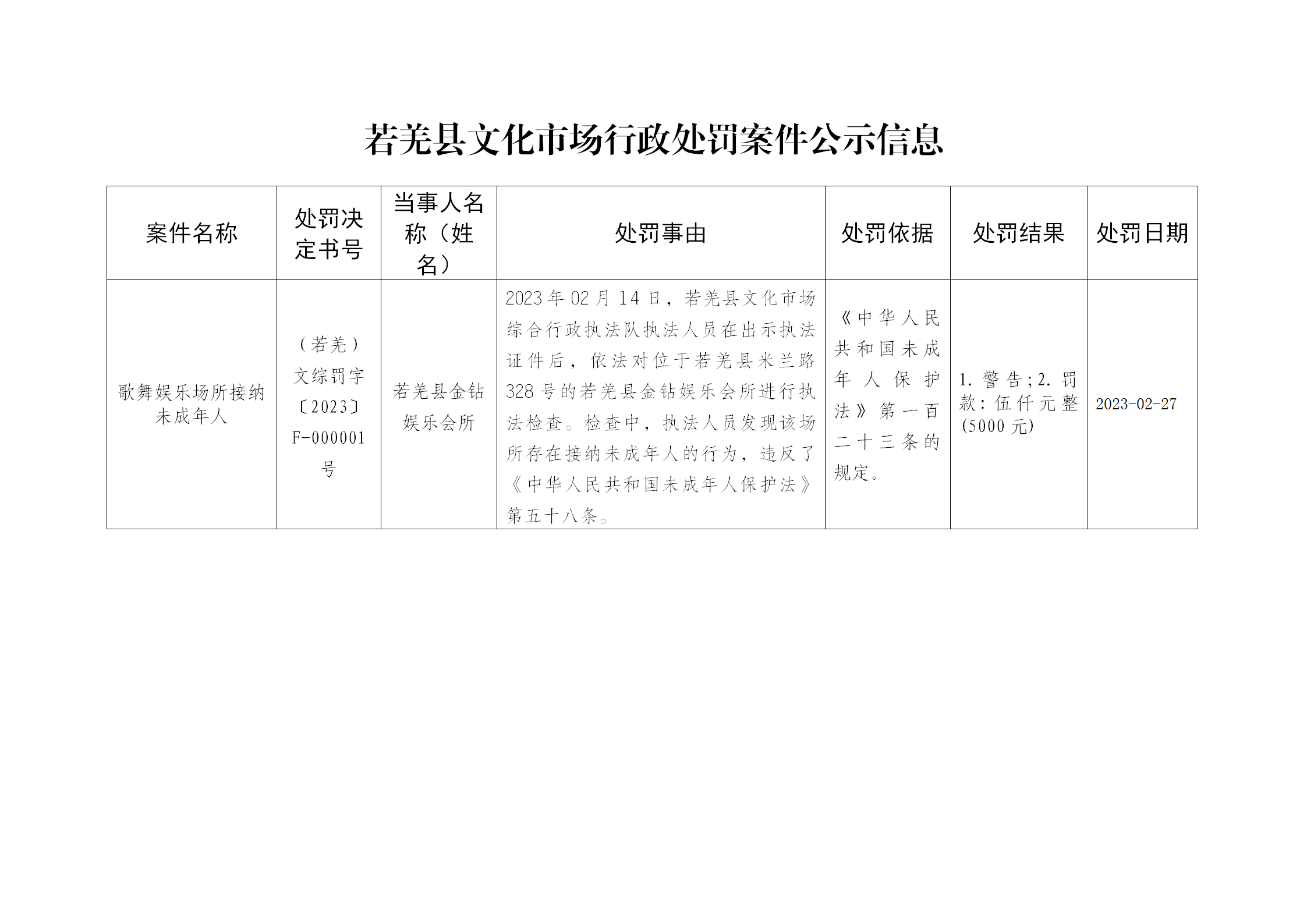 若羌县文化市场行政处罚案件公示信息文综罚字〔2023〕F-000001号