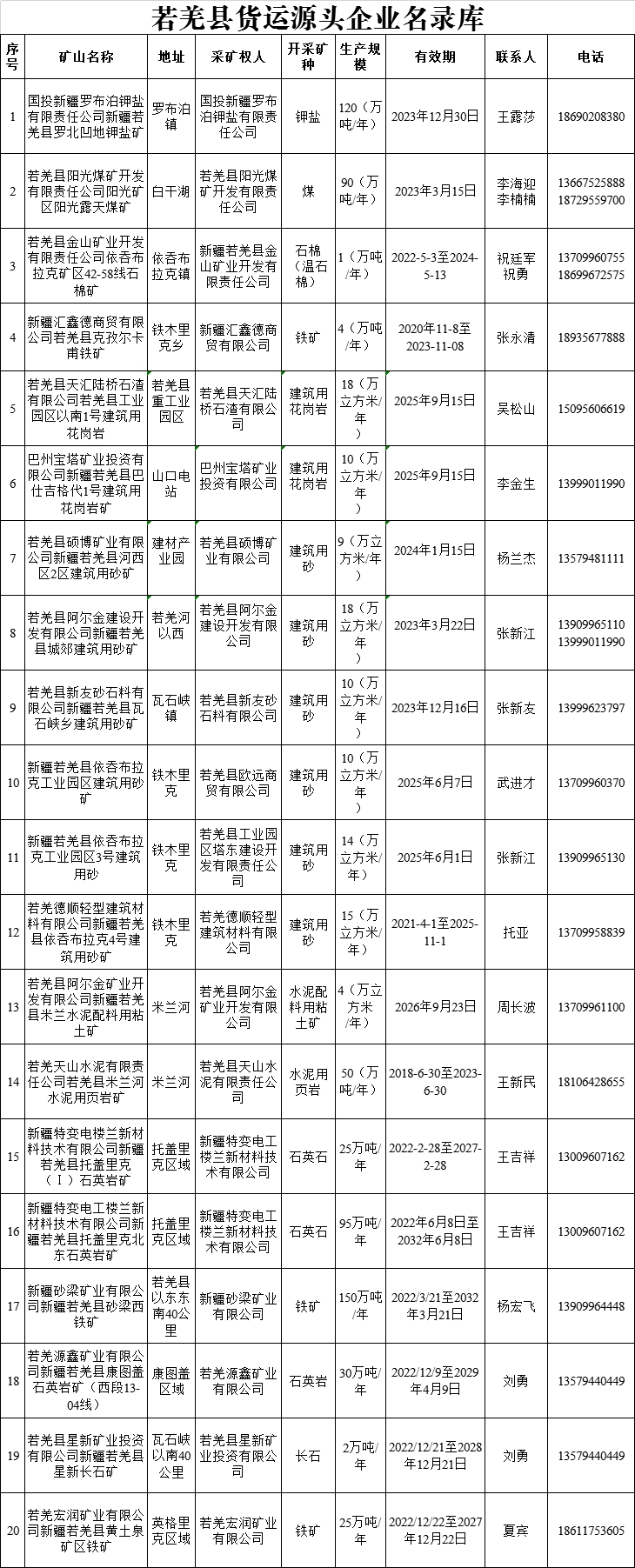 为进一步加强若羌县道路货物运输车辆超限超载治理工作,巩固源头治超成果,建立治超工作长效机制,推动源头治超工作不断深入,不断加强对货运源头企业监管力度。根据《新疆维吾尔自治区治理货物运输车辆超限超载治理办法》(自治区第207号主席令)相关要求,县交通运输局结合行业职能职责,联合县商务和工业信息化局、县市场监督管理局、县自然资源局、县路政执法大队、县工业园区管委会、各乡镇认真开展了若羌县县域货运源头企业信息排查工作,共摸排重点货运源头企业20家。现公示如下。