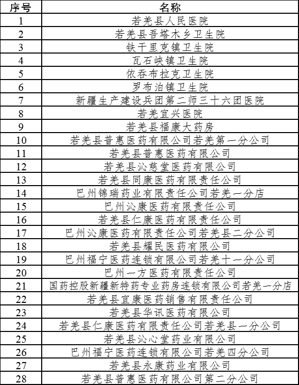 今年以来,若羌县医疗保障局高度重视医保基金监管工作,始终将打击欺诈骗保、维护基金安全作为首要政治任务。根据《巴州医疗保障局关于做好2023年基金监管工作的通知》(巴医保函〔2023〕7号)工作要求,现将若羌县28家已签订信用承诺书和行业自律书的医保定点医药机构名单,公示如下: