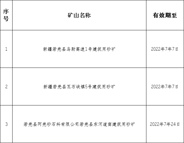 新疆若羌县乌尉高速1号建筑用砂矿等3个建筑用砂矿采矿许可证已过期(见附表),1、根据《新疆维吾尔自治区矿产资源管理若干事项暂行办法》(新自然资规〔2021〕1号)第十八条【矿业权自行废止和注销】除不可抗力或政府及其有关部门原因外,矿产资源勘查、采矿许可证有效期届满,矿业权人未在规定期限内申请延续、保留、注销登记;或申请延续、保留时自然资源主管部门依法不予登记且矿业权人在规定期限内未申请注销登记的,按照矿业权出让、登记权限,由自然资源主管部门在门户网站(或同级政府门户网站)公示60日,公示期满无异议的自行废止,予以注销。