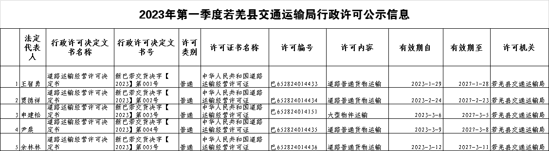 2023年第一季度若羌县交通运输局行政许可公示信息
