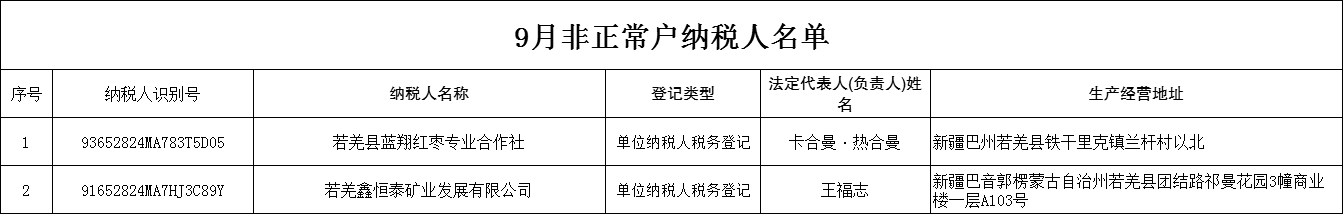 根据《国家税务总局关于进一步完善税务登记管理有关问题的公告》(国家税务总局公告【2011年】21号)文件规定,现将2023年9月30日前认定为非正常户的纳税人情况予以公告。