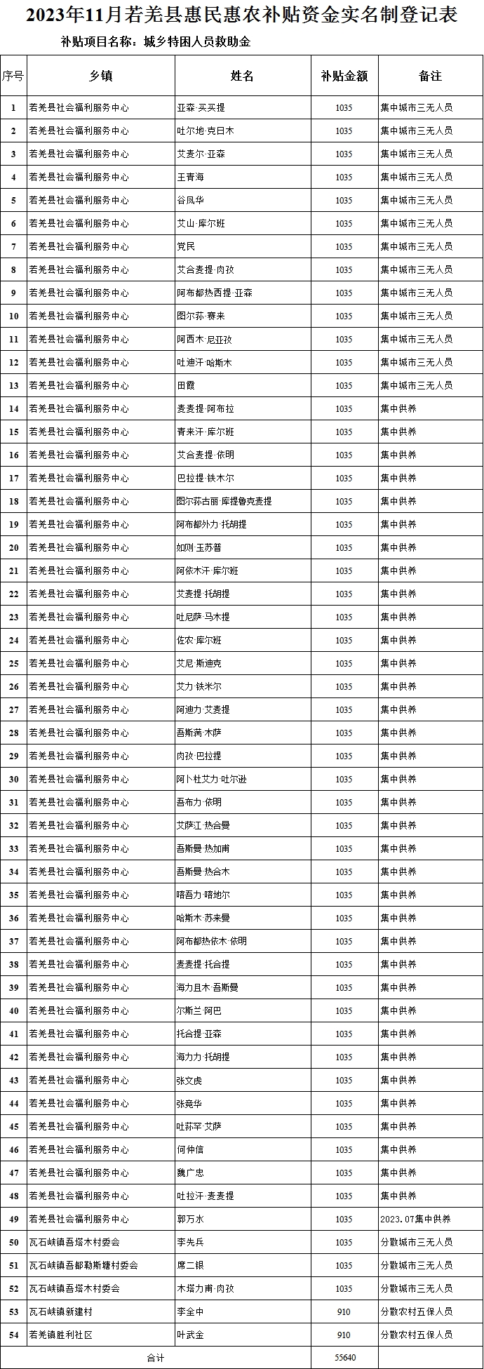 2023年11月若羌县惠民惠农补贴资金情况(城乡特困人员救助金)