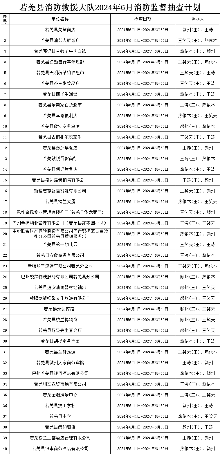 若羌县消防救援大队2024年6月消防监督抽查计划