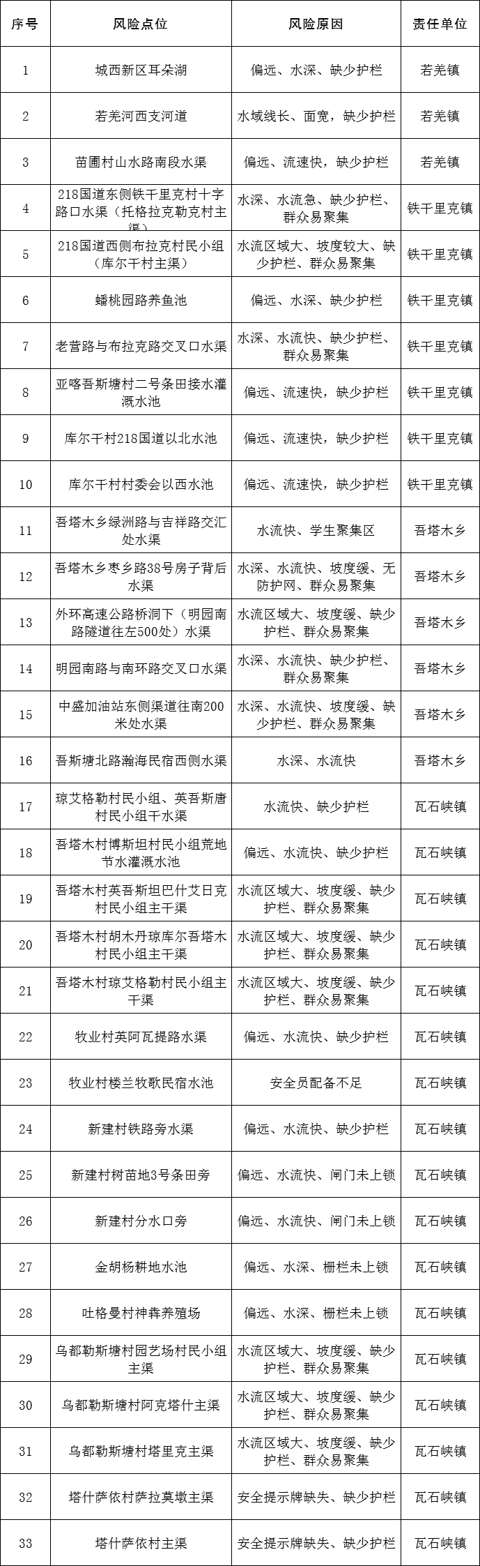 防溺水工作需要家长、社会及有关部门尽心尽责、齐抓共管、联防联控。近期,若羌县各乡镇对辖区溺水风险点进行详细摸排,共排查出32处溺水风险点。在此郑重提醒广大群众珍爱生命,远离溺水风险点。让我们携手共同预防溺水事故的发生,为孩子们的健康和安全保驾护航。