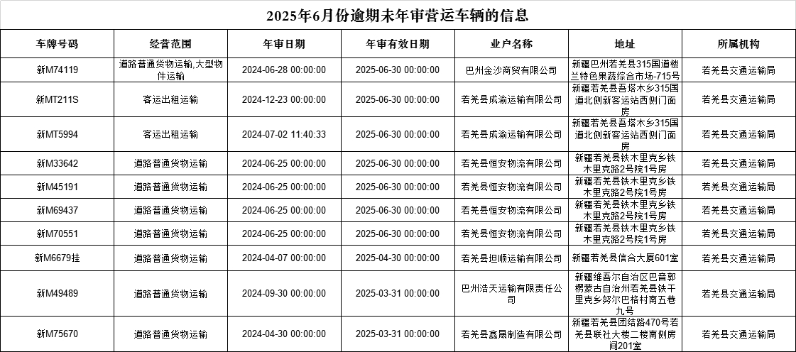 为进一步消除道路交通安全源头隐患,全面净化道路交通环境,有效提高交通管理水平,于2025年7月25日前以下车辆所有人、企业法人及时到若羌县行政服务中心交通运输局窗口(A11)办理相关手续。逾期不办理的,将根据《中华人民共和国行政许可法》第七十条第(一)项“行政许可有效期届满未延续的”、“行政机关应当依法办理有关行政许可的注销手续”、《中华人民共和国道路运输条例》第二十一条第(一)项之规定,对其《道路运输经营许可证》、《道路运输证》依法予以注销。