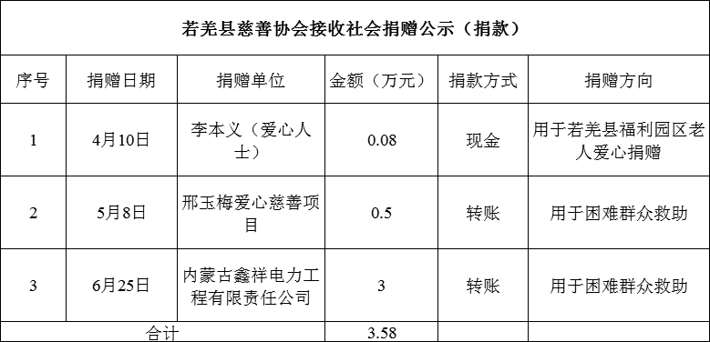 2025年1月1日至6月30日,若羌县慈善协会累计接收社会捐款3.58万元,接收物资(价值)3.54万元,所接收捐赠属于定向捐赠,按照捐赠协议执行,现将社会捐赠公示如下: