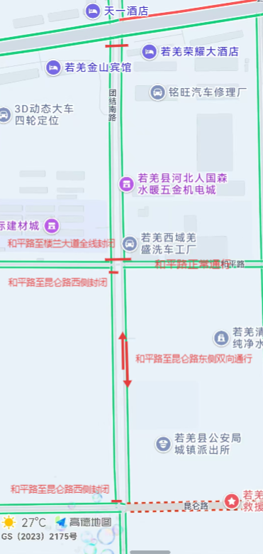 三、绕行路线:途经该路段车辆可从团结南路东侧车道(和平路-昆仑路路段)按通行标志双向通行或绕行楼兰大道胜利南路。