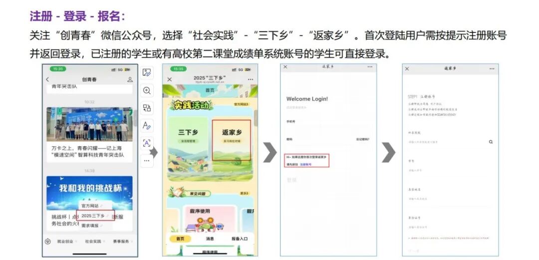 关注“创青春”微信公众号,选择“社会实践”-“官方网站”-“社会实践活动报名入口”。首次登陆用户需按提示注册账号并返回登录,已注册的学生或有高校第二课堂成绩单系统账号的学生可直接登录。登录成功后点击“返家乡项目”-项目列表,浏览单位发布的项目信息,浏览项目信息详情,选择中意的项目报名。