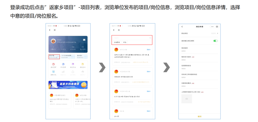 登录到梦空间APP,在“本校”-“社会实践”,进入社会实践管理系统,页面与“创青春”登录后界面一致,点击“返家乡项目”可在“岗位列表”里选择中意的岗位报名。