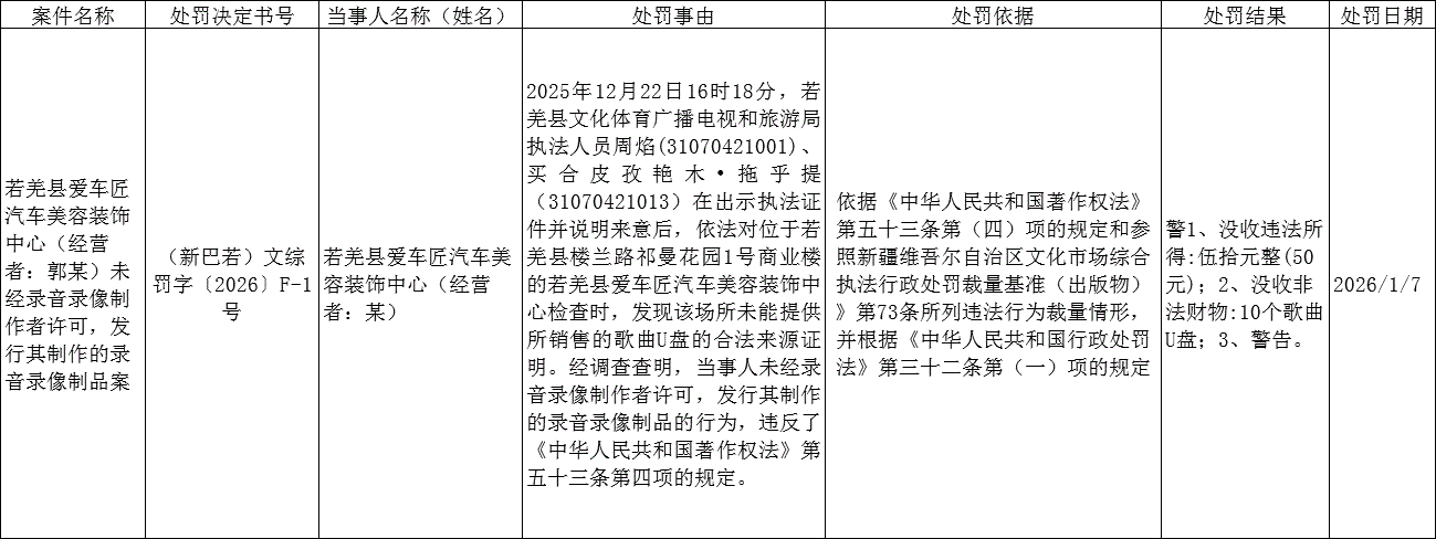 若羌县文化市场行政处罚案件公示信息