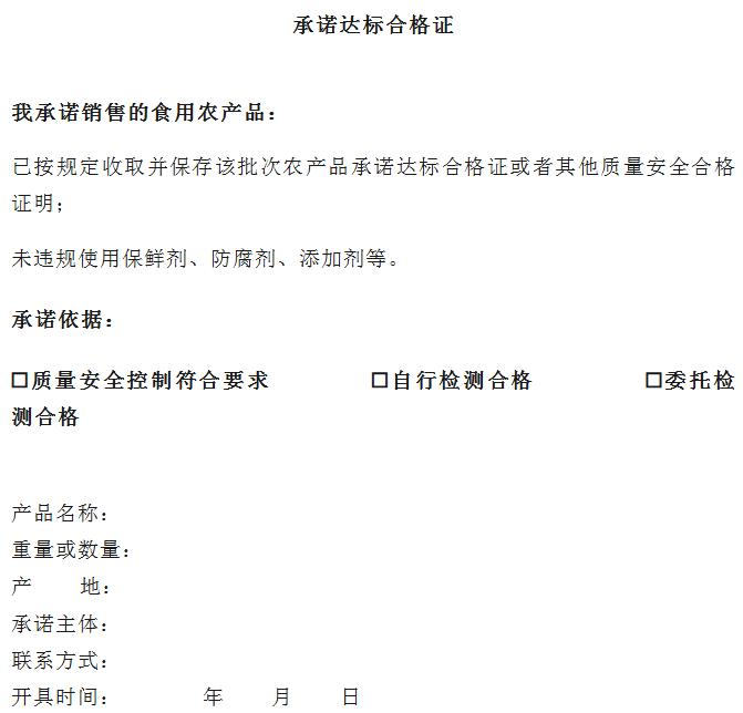 承诺事项:农产品生产者承诺其生产销售的农产品未使用禁用农药、兽药及其他化合物;使用的常规农药、兽药残留不超标。从事农产品收购的单位或者个人承诺已按规定收取并保存该批次农产品承诺达标合格证或者其他质量安全合格证明;未违规使用保鲜剂、防腐剂、添加剂等。单位或者个人对其收购的农产品进行混装或者分装后销售时,应当根据收购后的质量安全控制、检测结果开具承诺达标合格证,开具记录保存六个月。根据实际情况在质量安全控制符合要求、自行检测合格、委托检测合格三种依据中至少选择一种。对未按规定开具承诺达标合格证的,依据《中华人民共和国农产品质量安全法》进行处罚。
