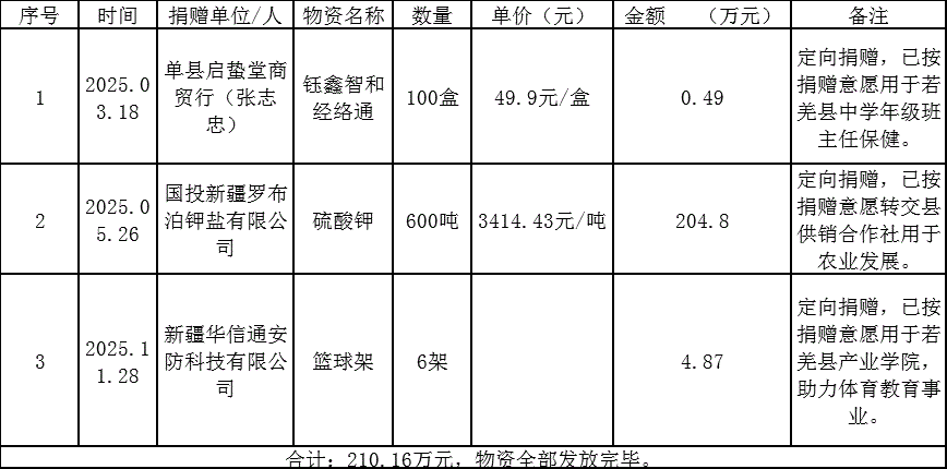 2025年度,若羌县红十字会共接受社会定向捐赠物资210.16万元,支出210.16万元;接受捐赠资金15.33万元,支出定向捐赠资金14.65万元。