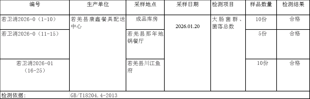 春节来临,为保障百姓安心过节,县疾病预防控制中心(卫生监督所)对我县康鑫集中餐具配送中心配送的餐饮具消毒效果进行消毒效果检测,共采集样品25份,检查结果均为合格,采样点位及检测结果如下: