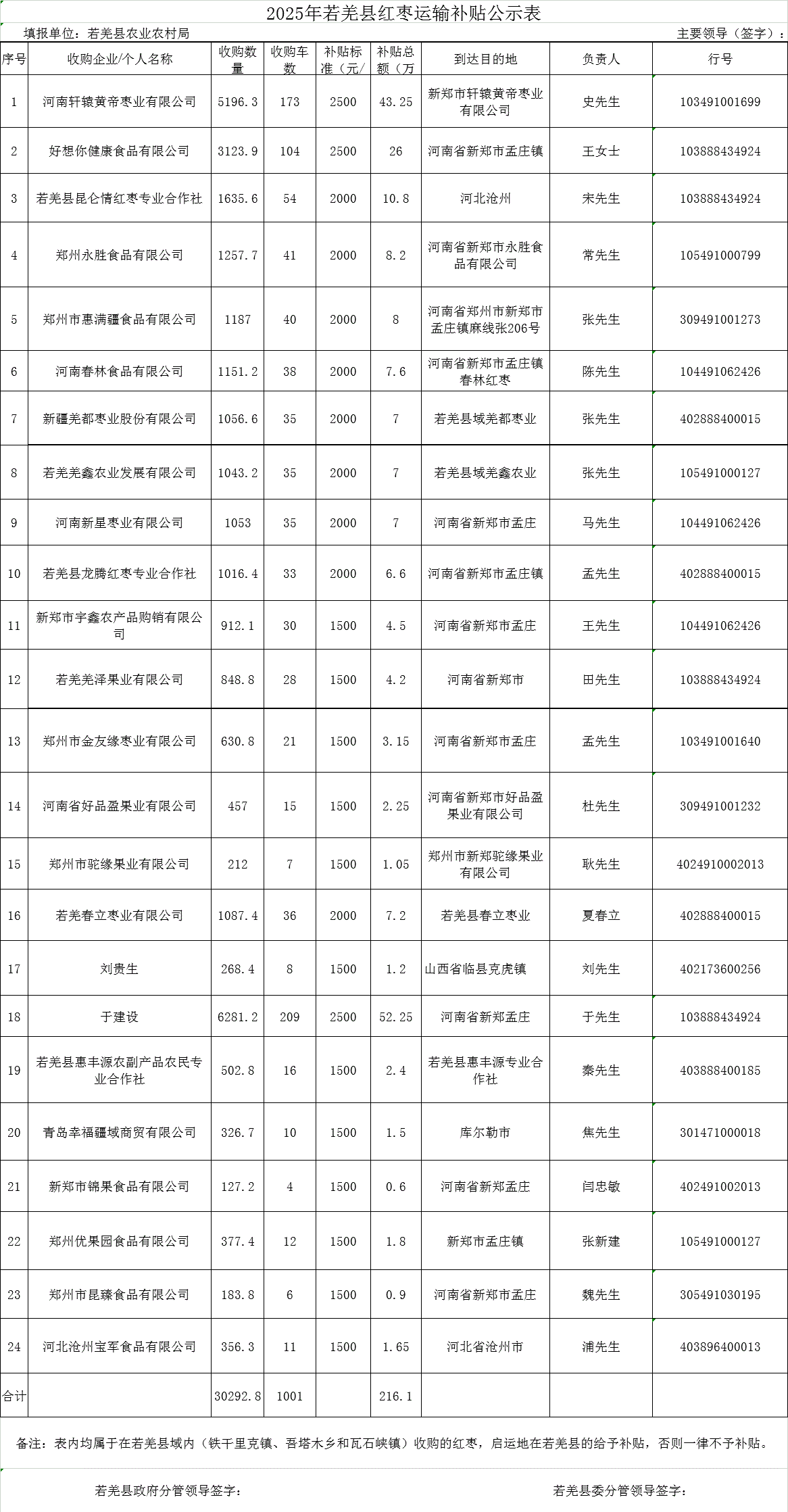 2025年若羌县红枣运输补贴公示表
