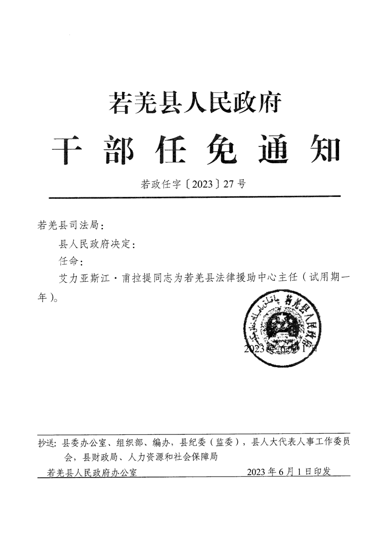 关于艾力亚斯江·普拉提同志职务任免的通知