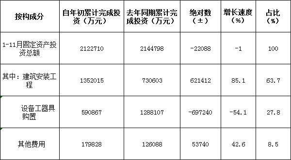 从投资构成看,建安工程投资作为形成实体经济的核心部分,在全县固定资产投资中占绝对主导地位。1-11月,建筑安装工程投资1352015万元,同比增长85.1%,拉动全县投资增速28.97个百分点,占全县投资比重63.7%。