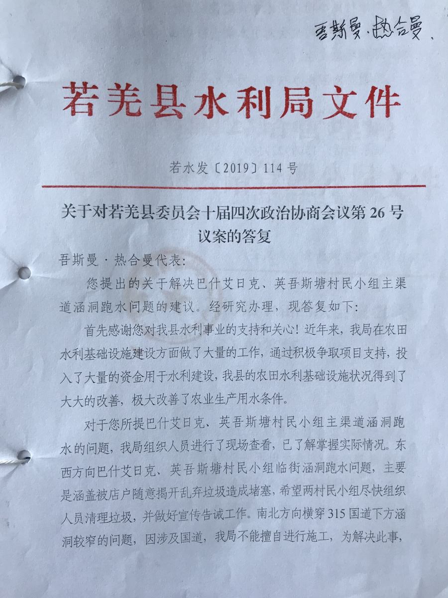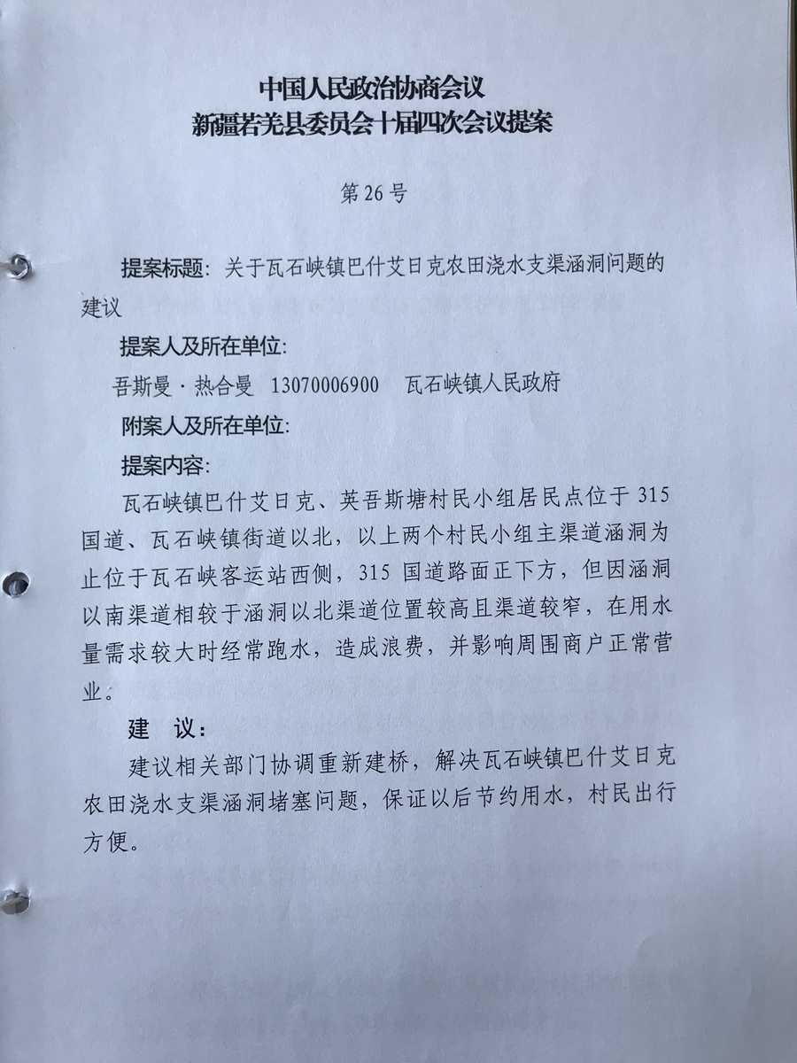 关于瓦石峡镇巴什艾日克农田浇水支渠涵洞问题的建议及答复