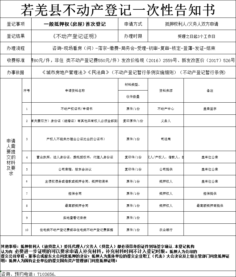 若羌县不动产登记一次性告知书(一般抵押权(房屋)首次登记)