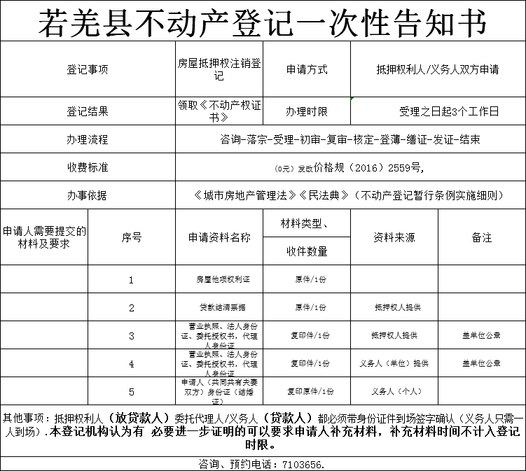 若羌县不动产登记一次性告知书(房屋抵押权注销登记)