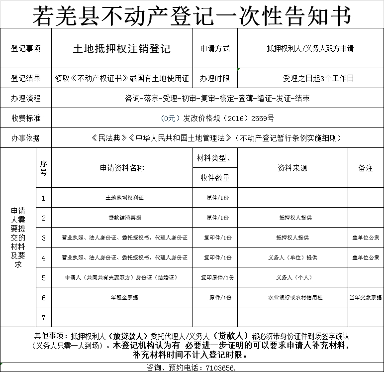 若羌县不动产登记一次性告知书(土地抵押权注销登记)