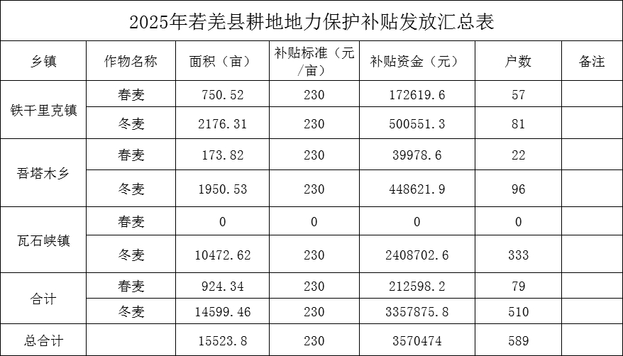 附:2025年若羌县耕地地力保护补贴发放汇总表