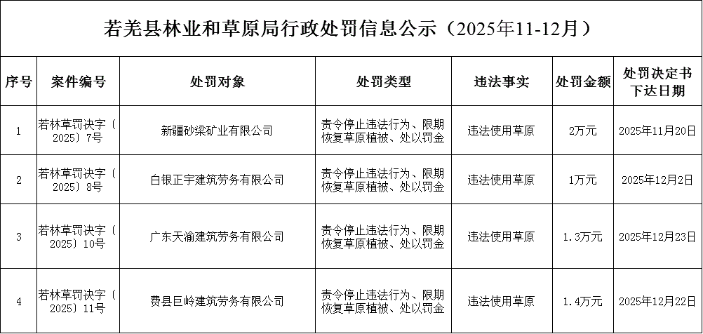 若羌县林业和草原局行政处罚信息公示(2025年11-12月)