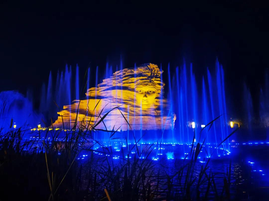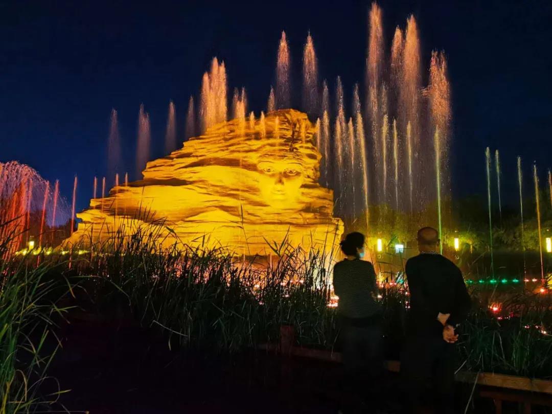 新疆巴音郭楞蒙古自治州若羌县楼兰历史文化公园里音乐喷泉绽放魅力。夜色下,喷泉和灯光随着音乐节奏变幻,时而波涛汹涌,时而婉约动人,一幅幅夜色璀璨的美景令人流连忘返。