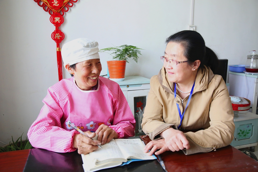 图为 李菊辉给工作队员分享自己的订单销售明细账本? 王洋 摄影