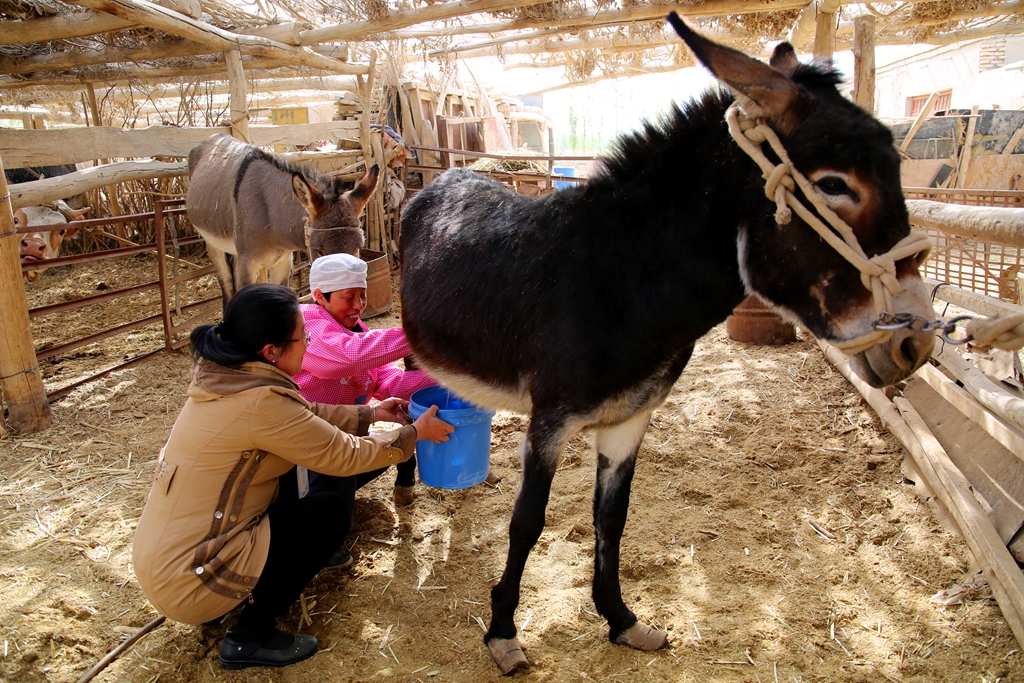 图为 县农业农村局驻铁干里克镇果勒吾斯塘村工作队队员帮助李菊辉挤“驴奶”? 王洋 摄影