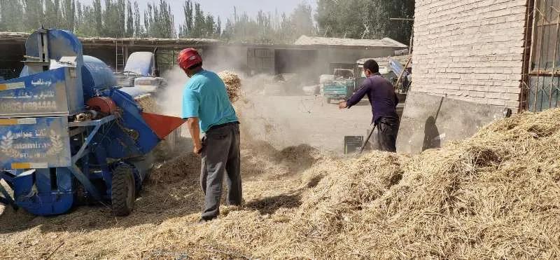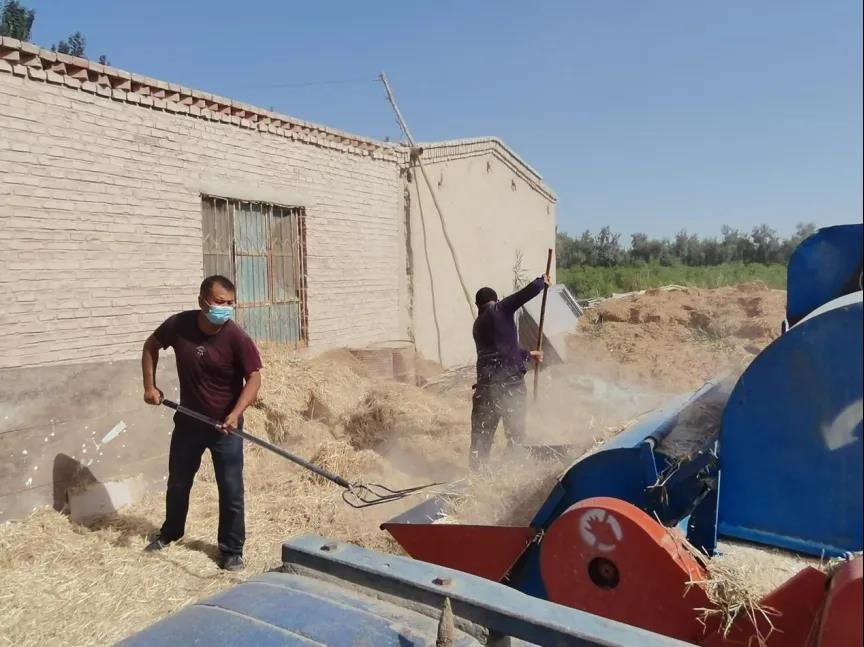 图为祁曼塔格乡党委副书记、乡长玉素甫·艾麦尔同志带头粉碎饲料
