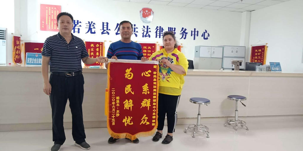 2020年6月23日上午,在县司法局法律援助服务大厅,受援人帕旦木·木沙的配偶阿迪力·莫来克送来了一面写有“为民解忧,心系群众”的锦旗。帕旦木·木沙对法律援助中心为他提供的法律援助服务表示非常满意并由衷地感谢。