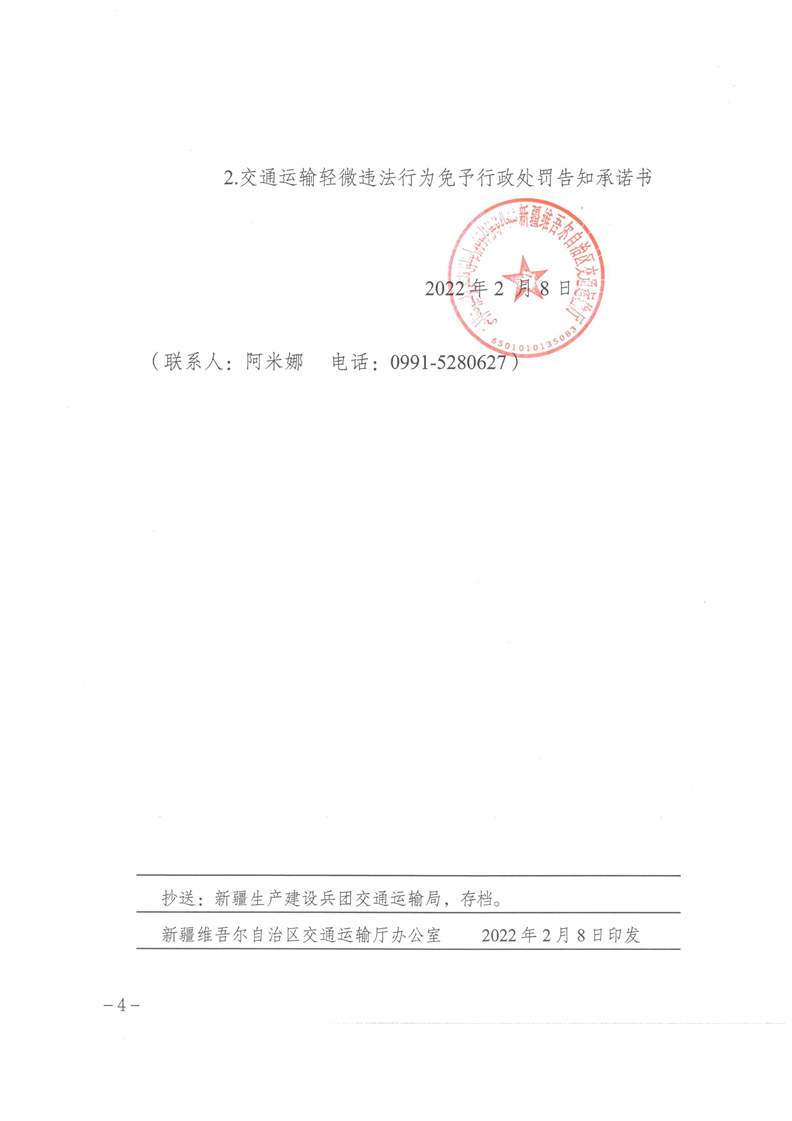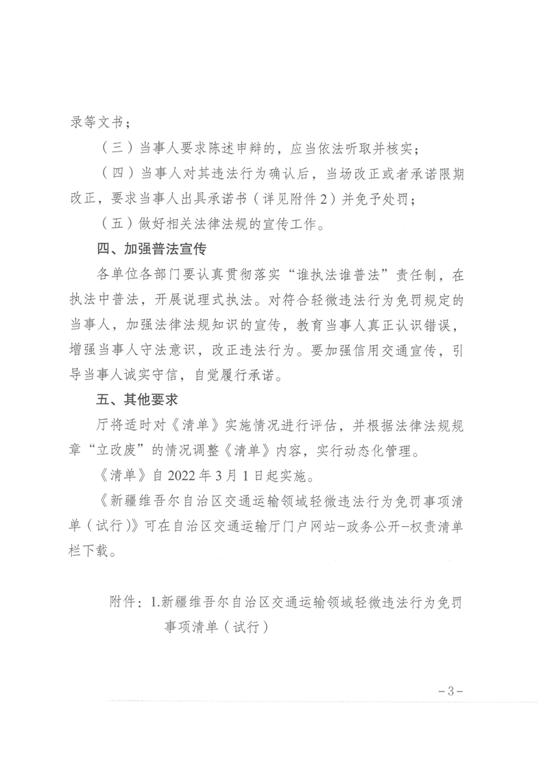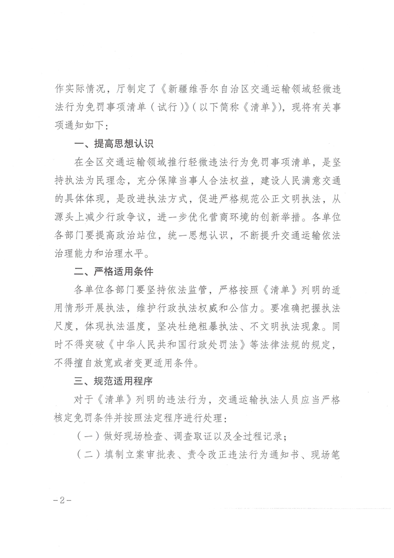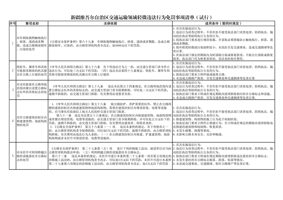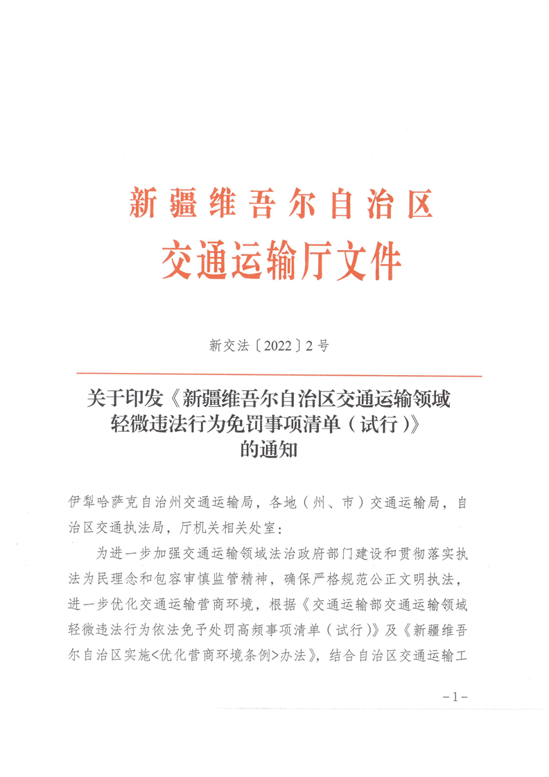 关于印发《新疆维吾尔自治区交通运输领域轻微违法行为免罚事项清单(试行)》的通知