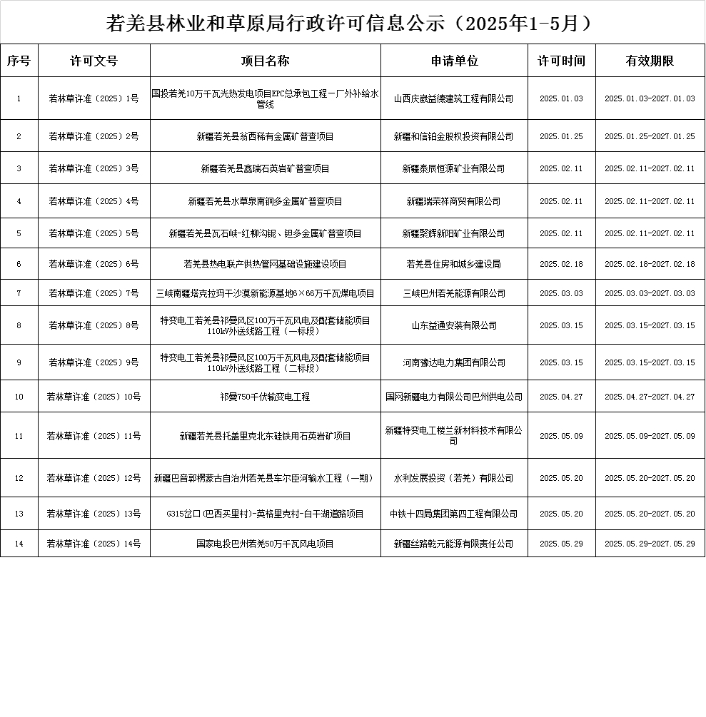 若羌县林业和草原局行政许可信息公示(2025年1-5月)