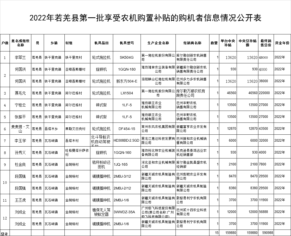 2022年若羌县第一批享受农机购置补贴的购机者信息情况公开表
