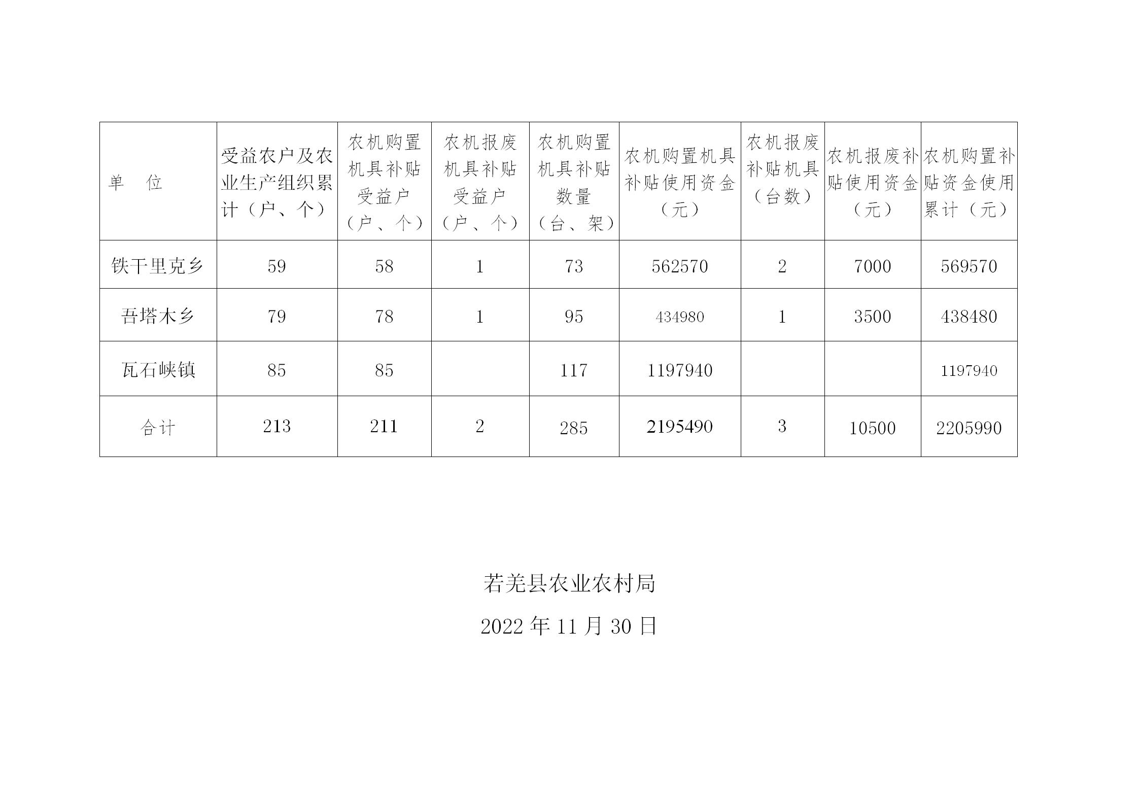 2022年,巴州农机局分配若羌县农机购置补贴资金220万元,历年结余农机购置补贴资金0.66万元,合计220.66万元。若羌县农机局严格按照自治区及州农业机械化发展中心的相关文件要求开展农机购置补贴项目工作,项目资金用于补贴农机购置机具及农机报废两项内容,共使用资金220.599万元,受益户213户,补贴机具288台架,其中:农机购置机具补贴使用资金219.549万元,受益户211户,补贴机具285台架;农机报废使用资金1.05万元,受益户2户,补贴报废拖拉机3台。现将2022年农机购置补贴资金的实际使用情况通告如下: