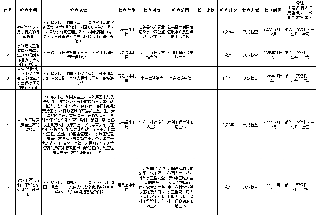 若羌县水利局2025年度涉企行政检查计划