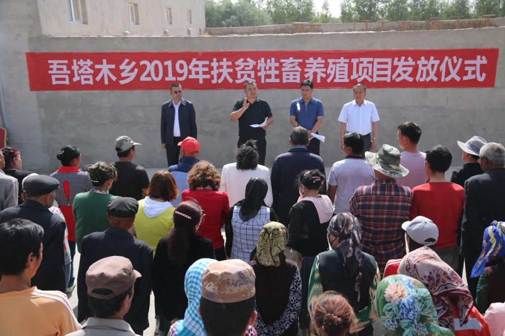 5月20日下午,吾塔木乡2019年扶贫牲畜养殖项目发放仪式在该乡牧业村养殖小区举行。
