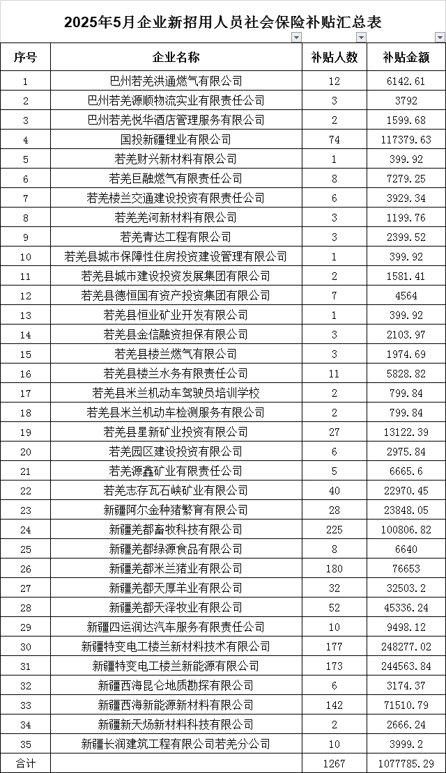 附件:2025年5月企业新招用人员社会保险补贴公示汇总表