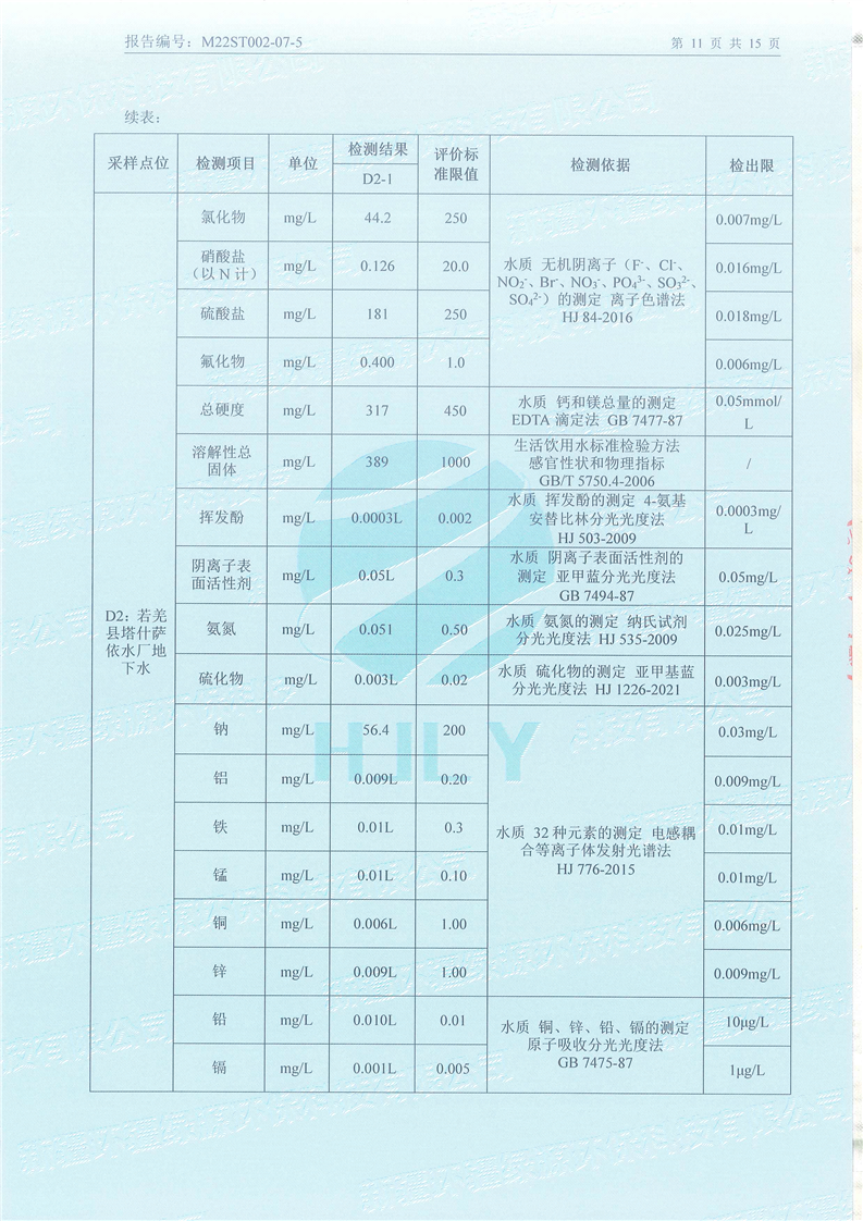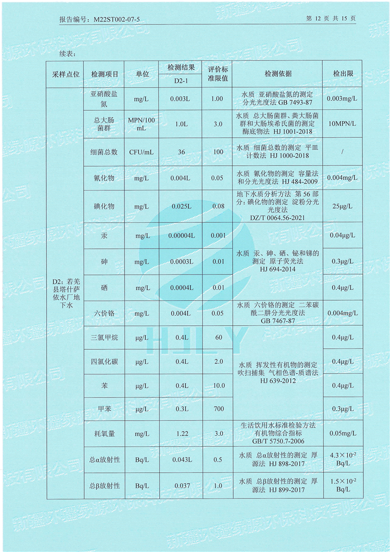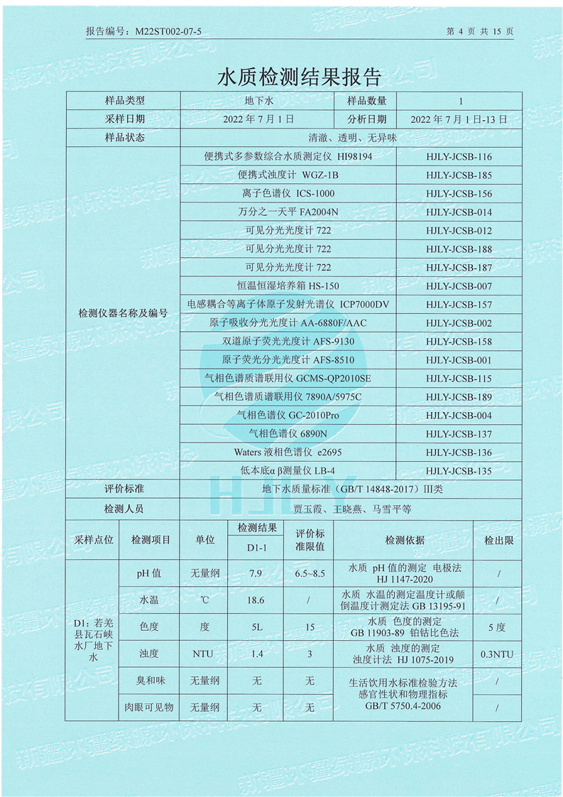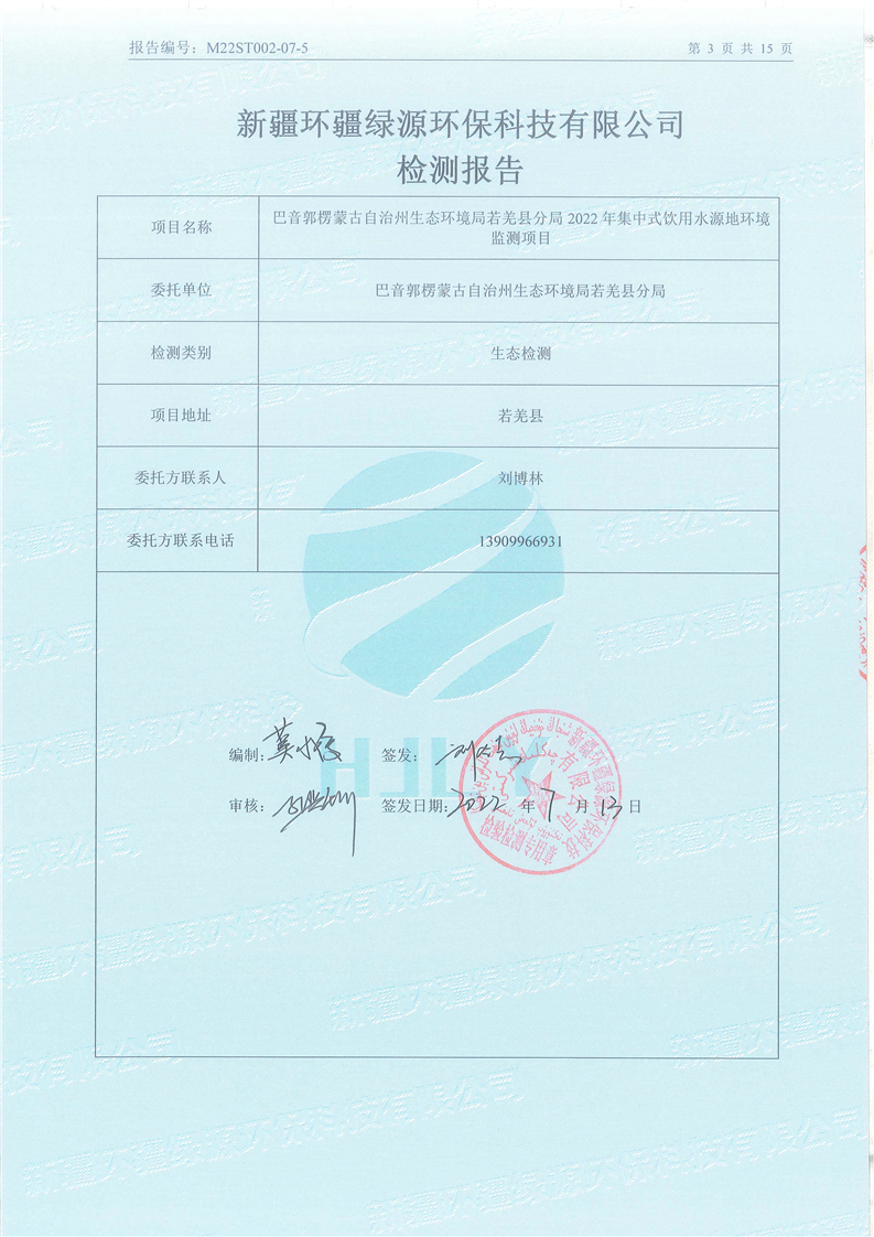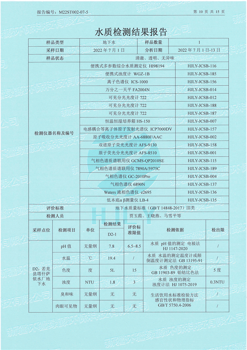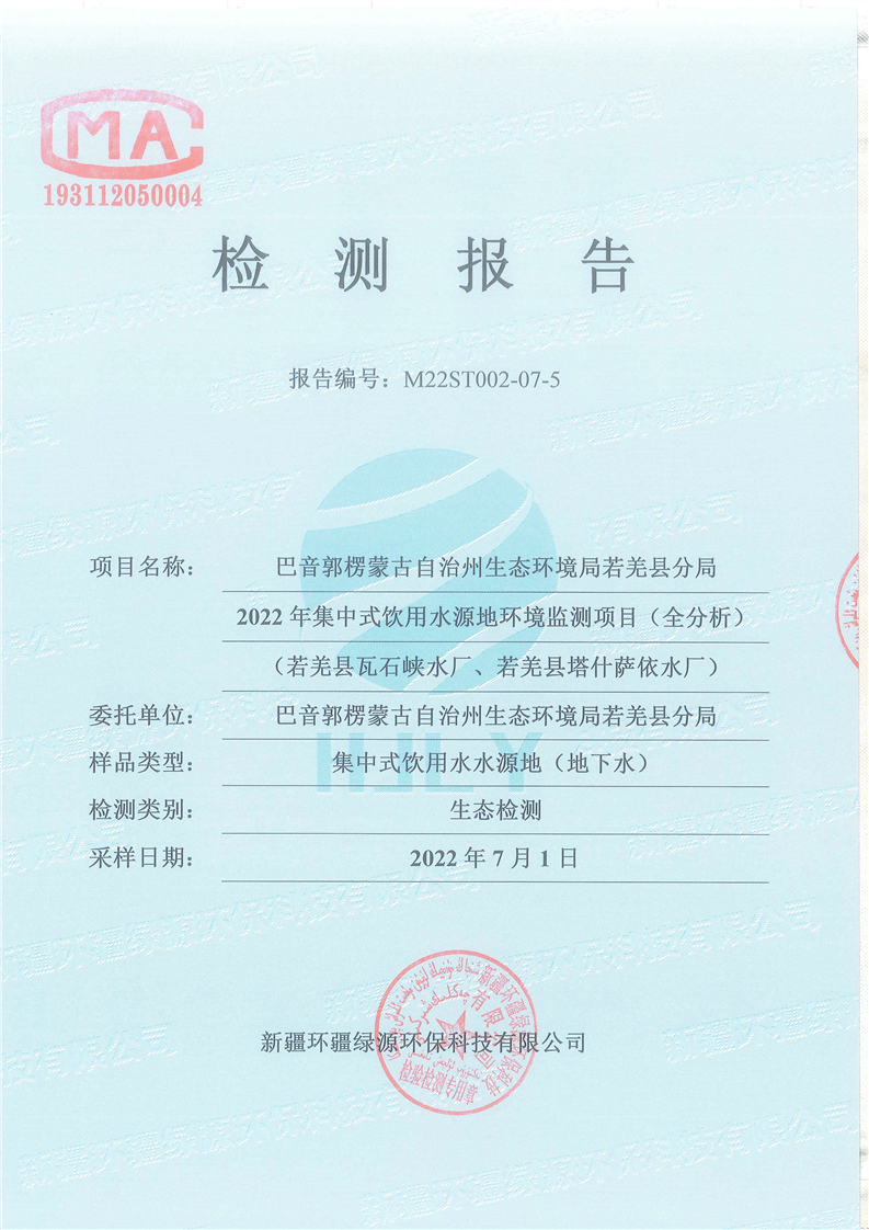 《若羌县瓦石峡集中式饮用水源地瓦石峡水厂、塔什萨依水厂地下水(全分析)环境监测报告》(2022年7月)