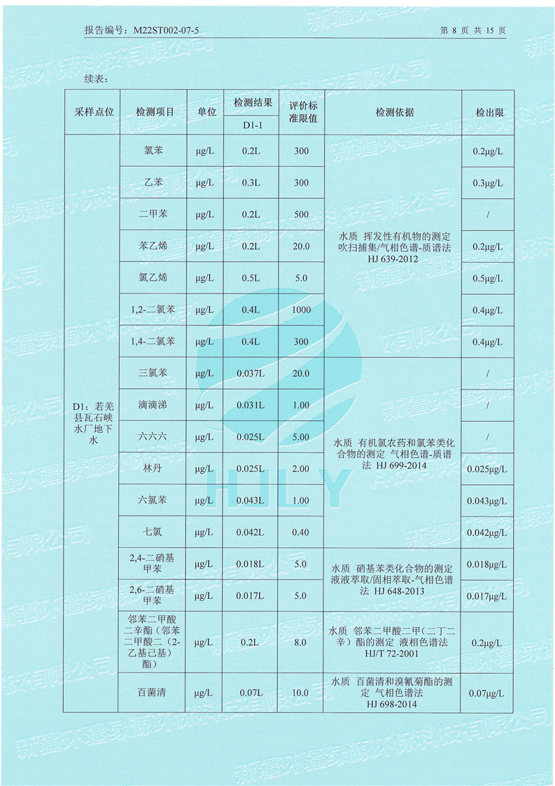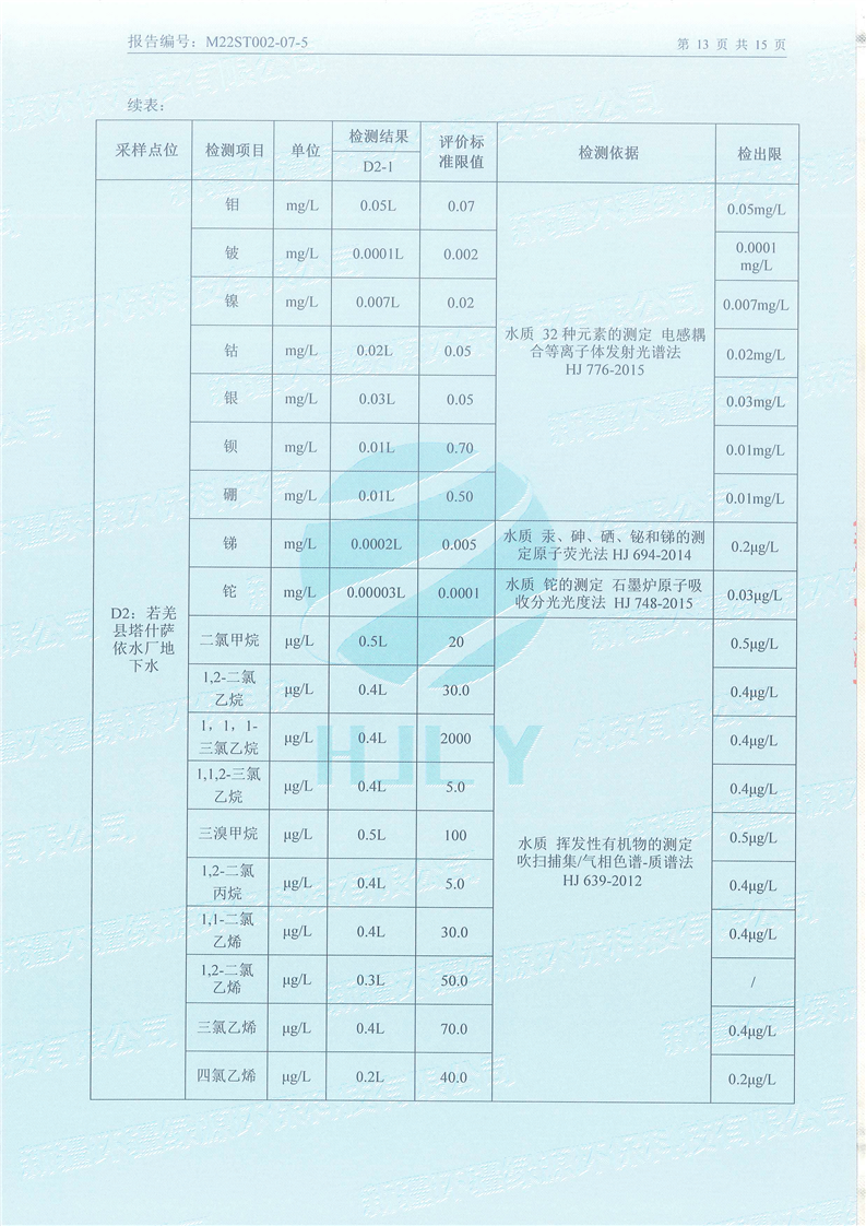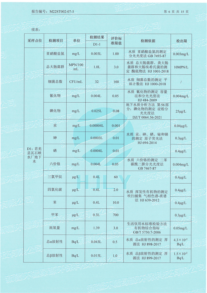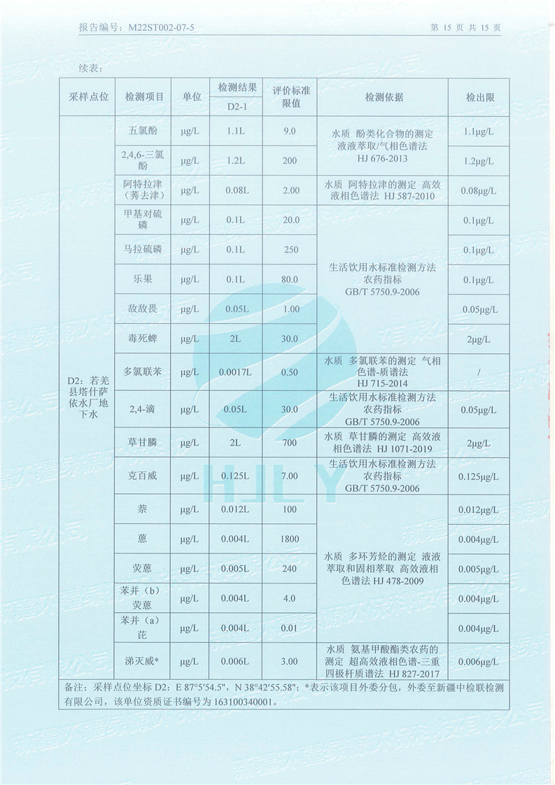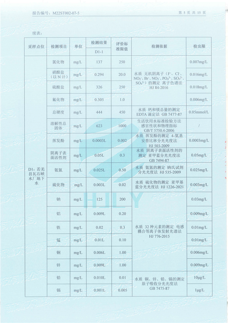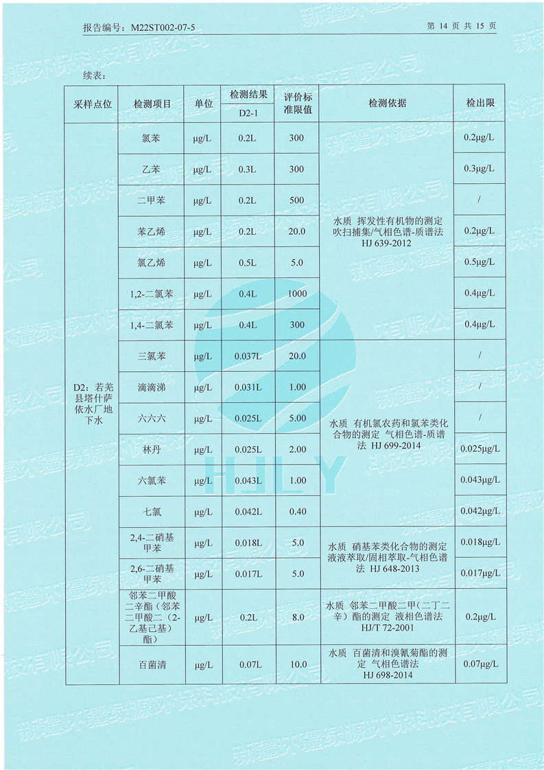 《若羌县瓦石峡集中式饮用水源地瓦石峡水厂、塔什萨依水厂地下水(全分析)环境监测报告》(2022年7月)