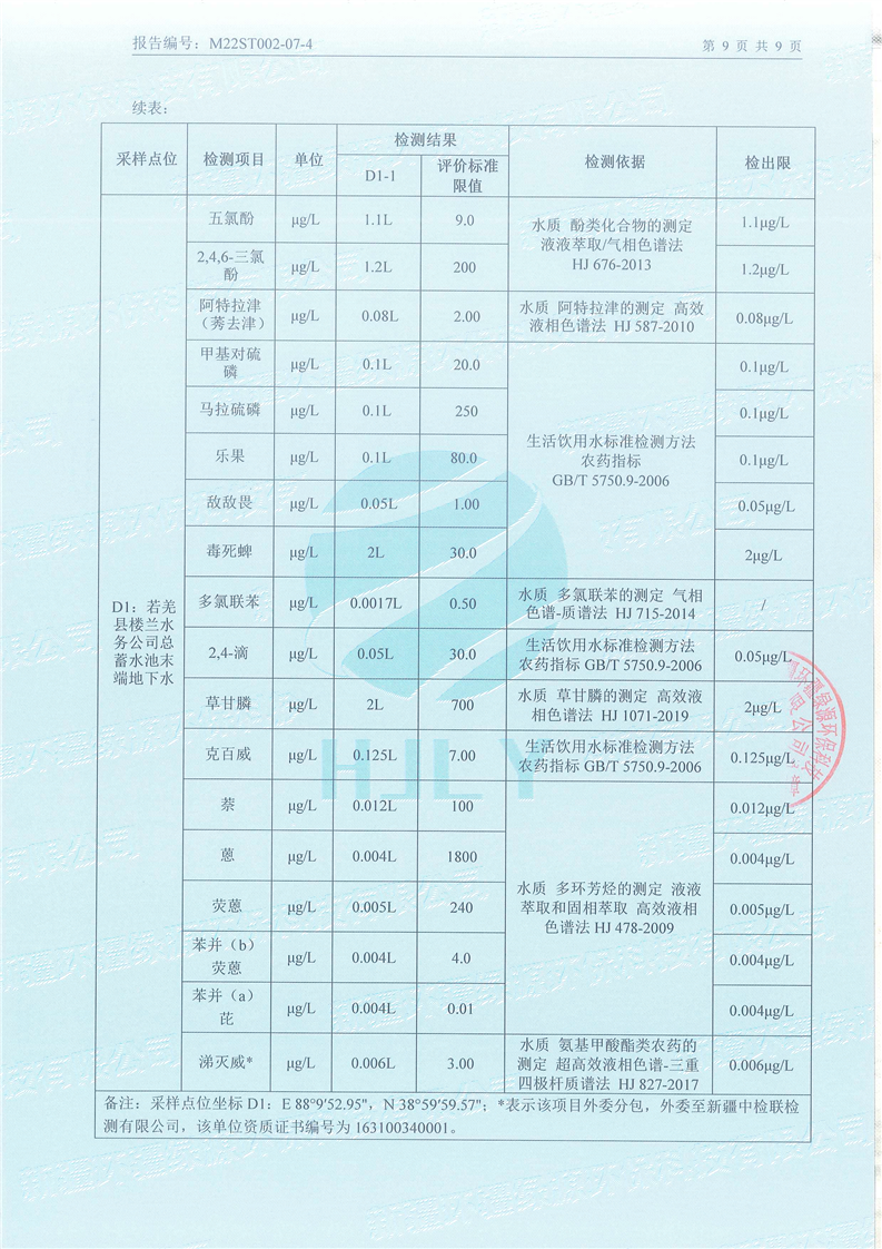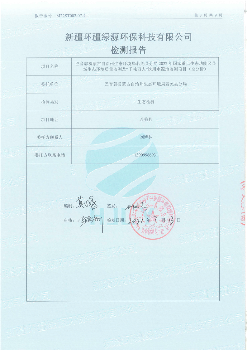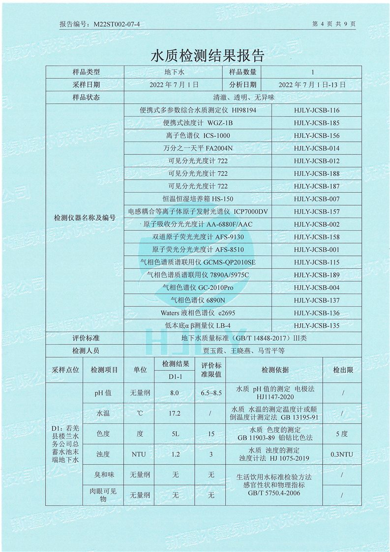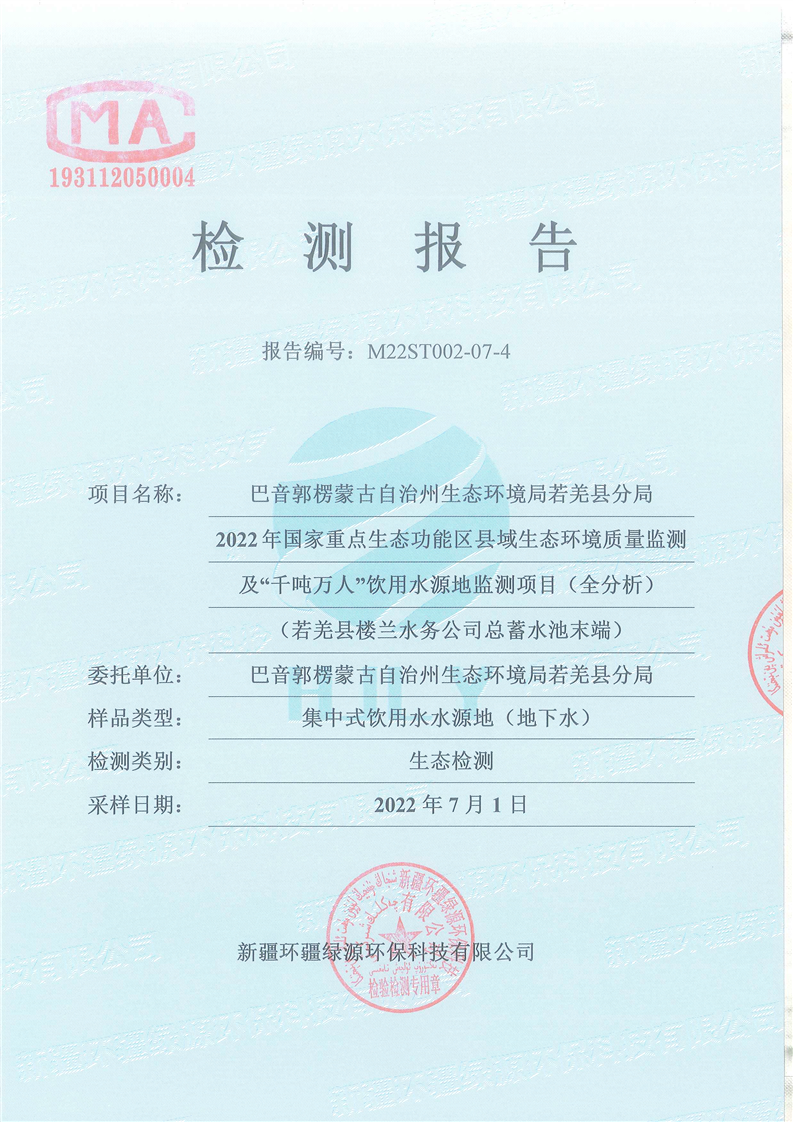 《若羌县城“千吨万人”集中式饮用水源地-楼兰水务总蓄水池末端地下水(全分析)环境监测报告》(2022年7月)