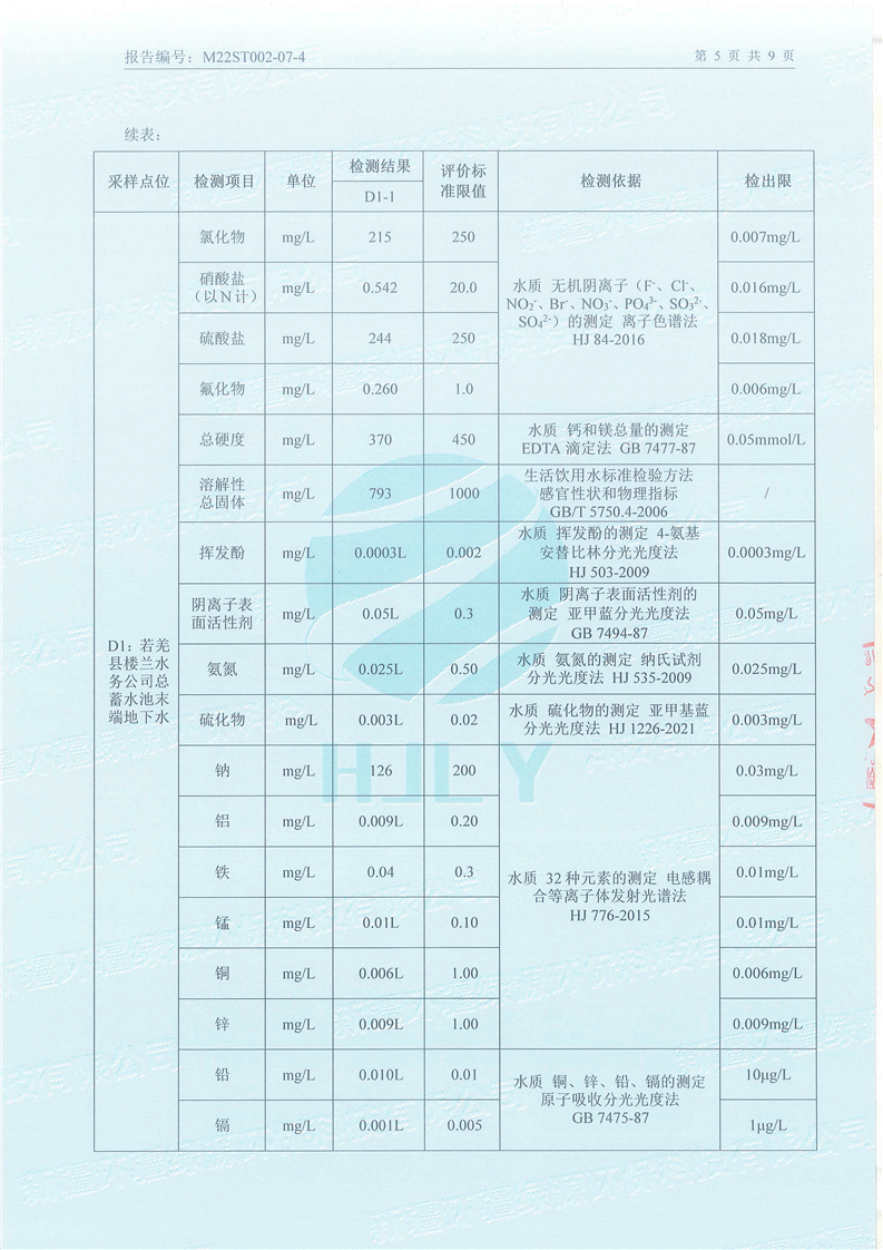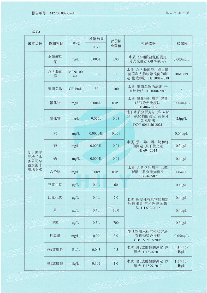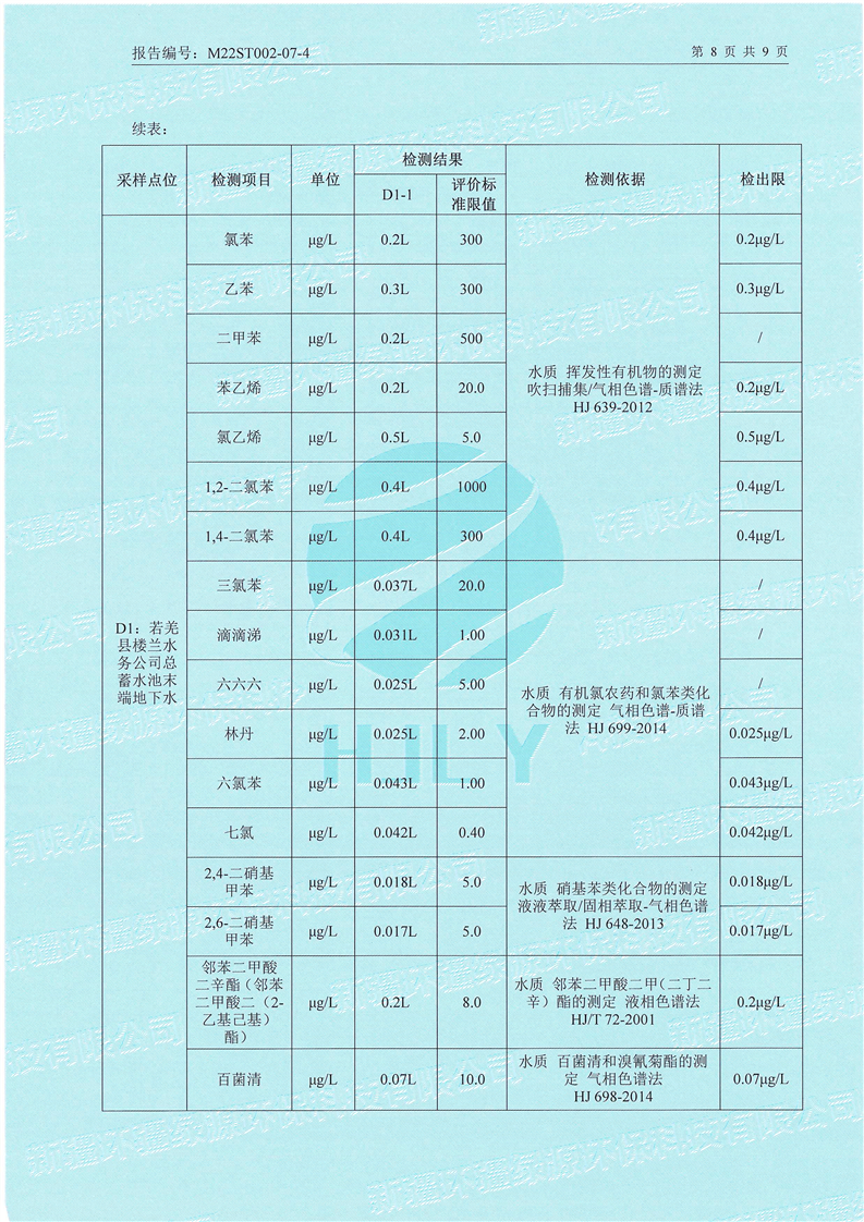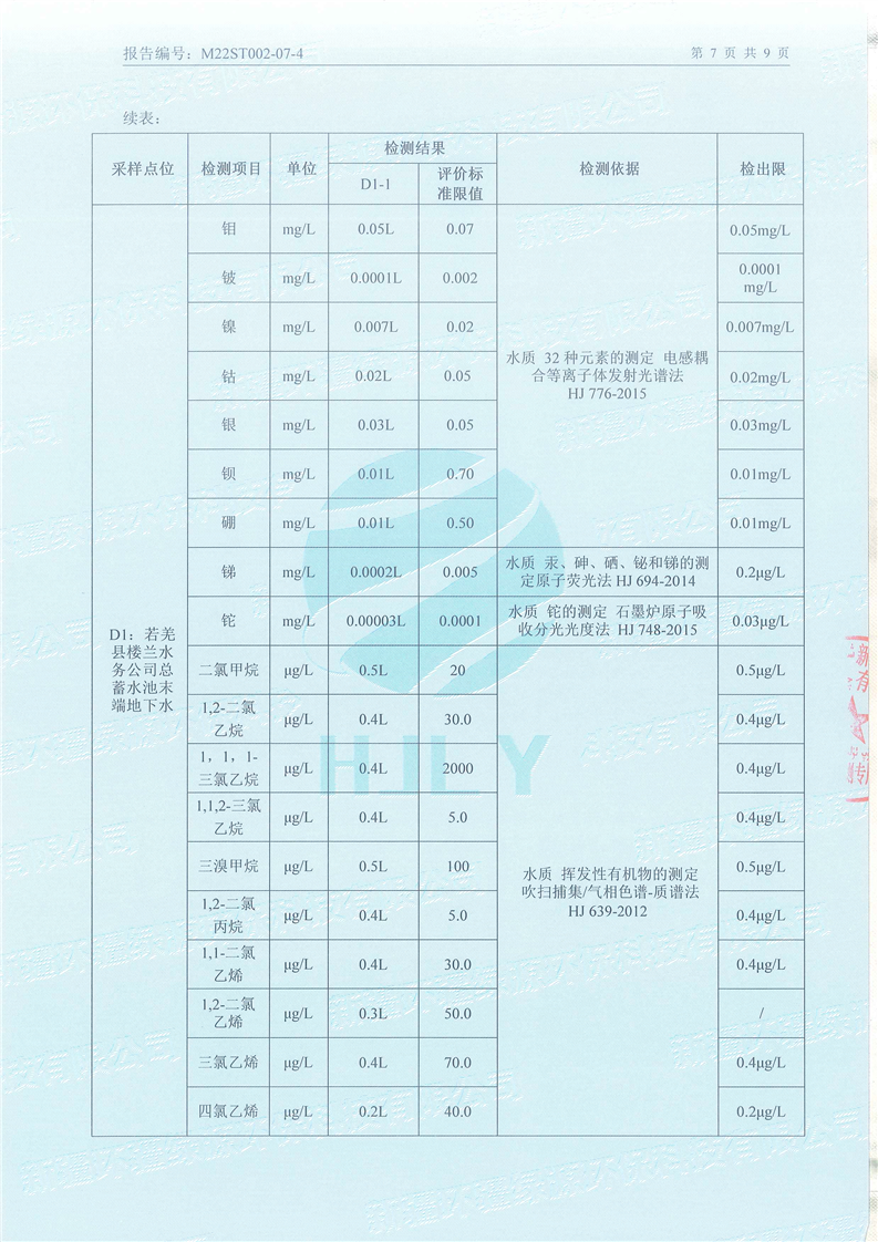 《若羌县城“千吨万人”集中式饮用水源地-楼兰水务总蓄水池末端地下水(全分析)环境监测报告》(2022年7月)